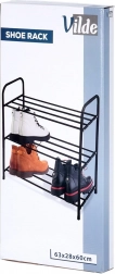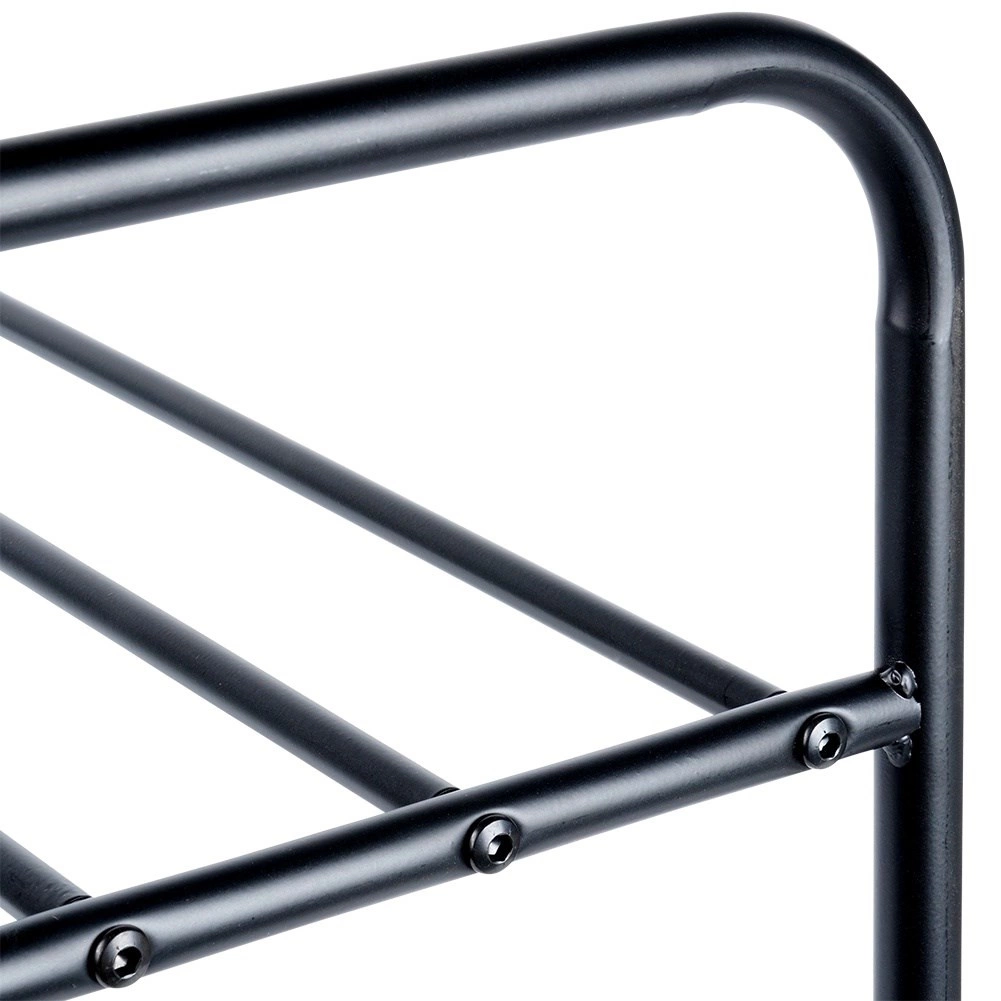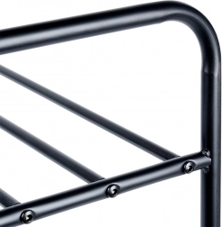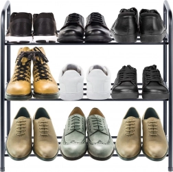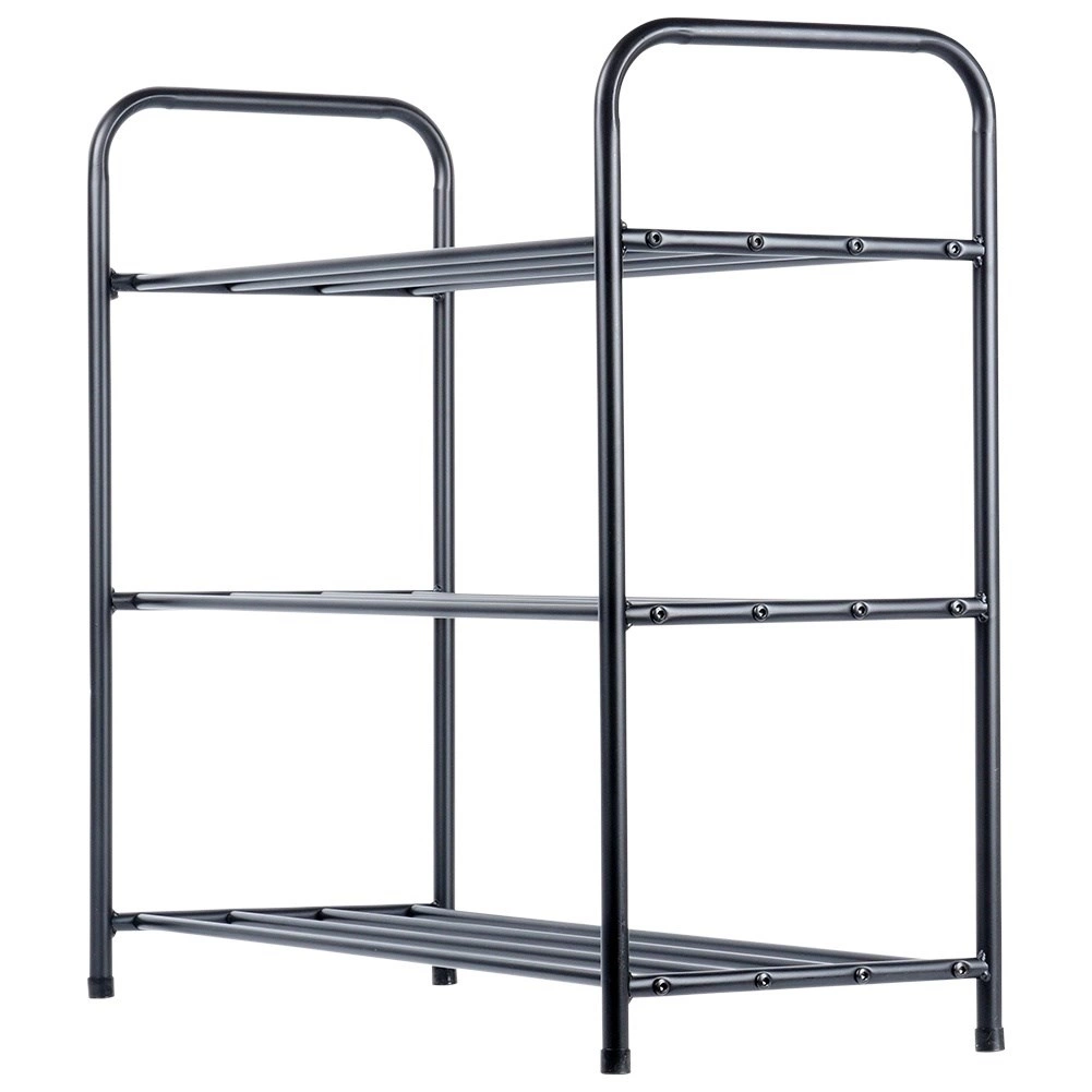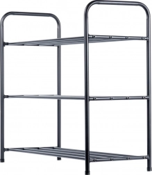 This three-tier metal shoe rack keeps your home tidy and organized. The open design with tubular shelves enables air circulation and keeps footwear ventilated and easy to reach. The robust frame made of powder-coated metal in matte black is stable and durable, yet lightweight for easy moving.