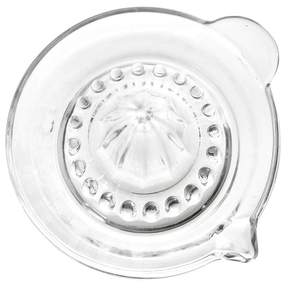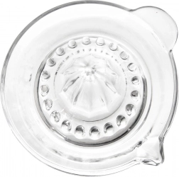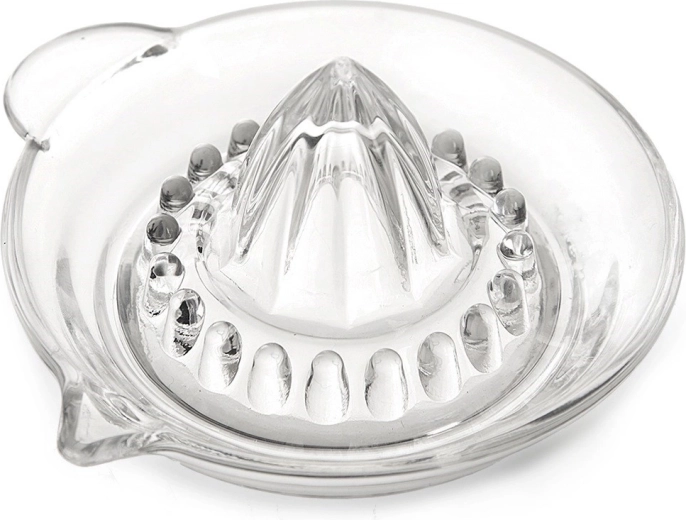 Classic glass citrus juicer for quick preparation of fresh juice from lemons, oranges, or limes. It has an integrated cone with seed catchers, a practical pour spout, and a handle for easy, spill-free pouring. Durable clear glass, simple operation, and dishwasher safe. Ideal for lemonades, tea, and everyday use.
