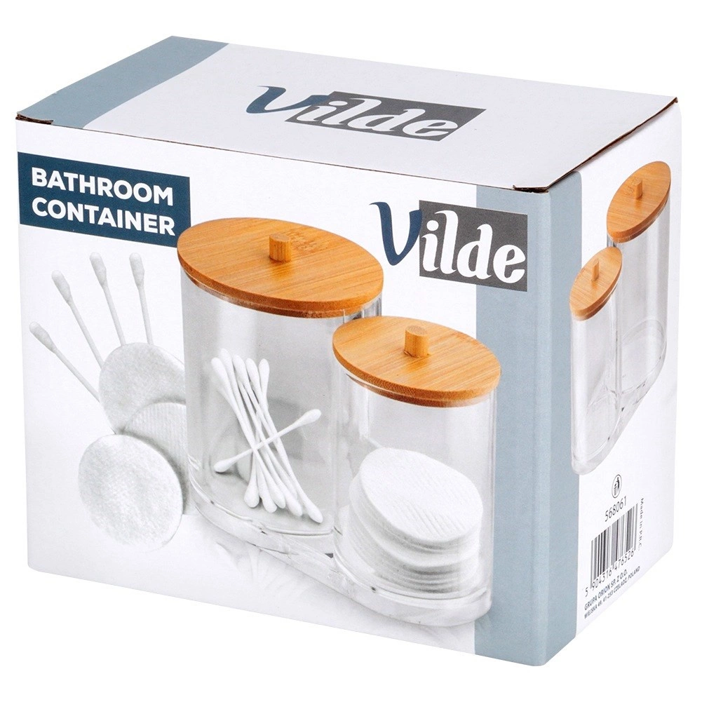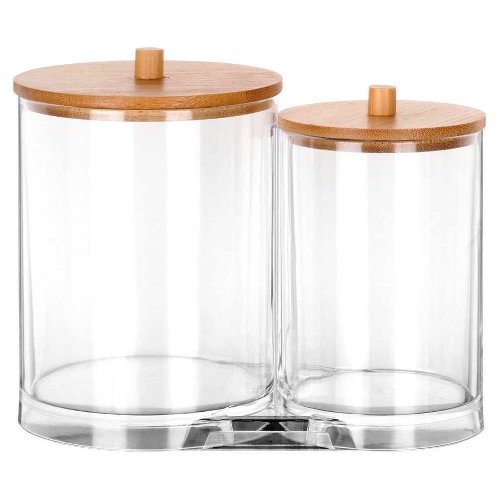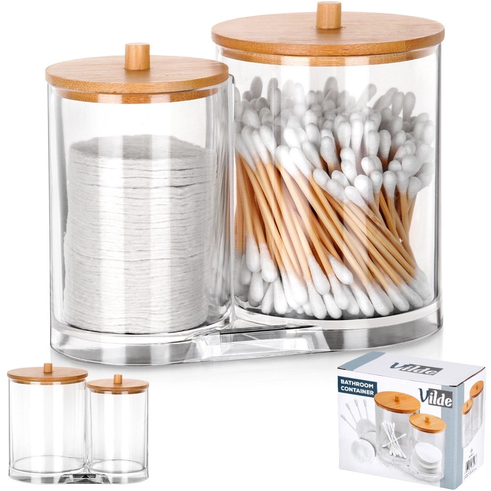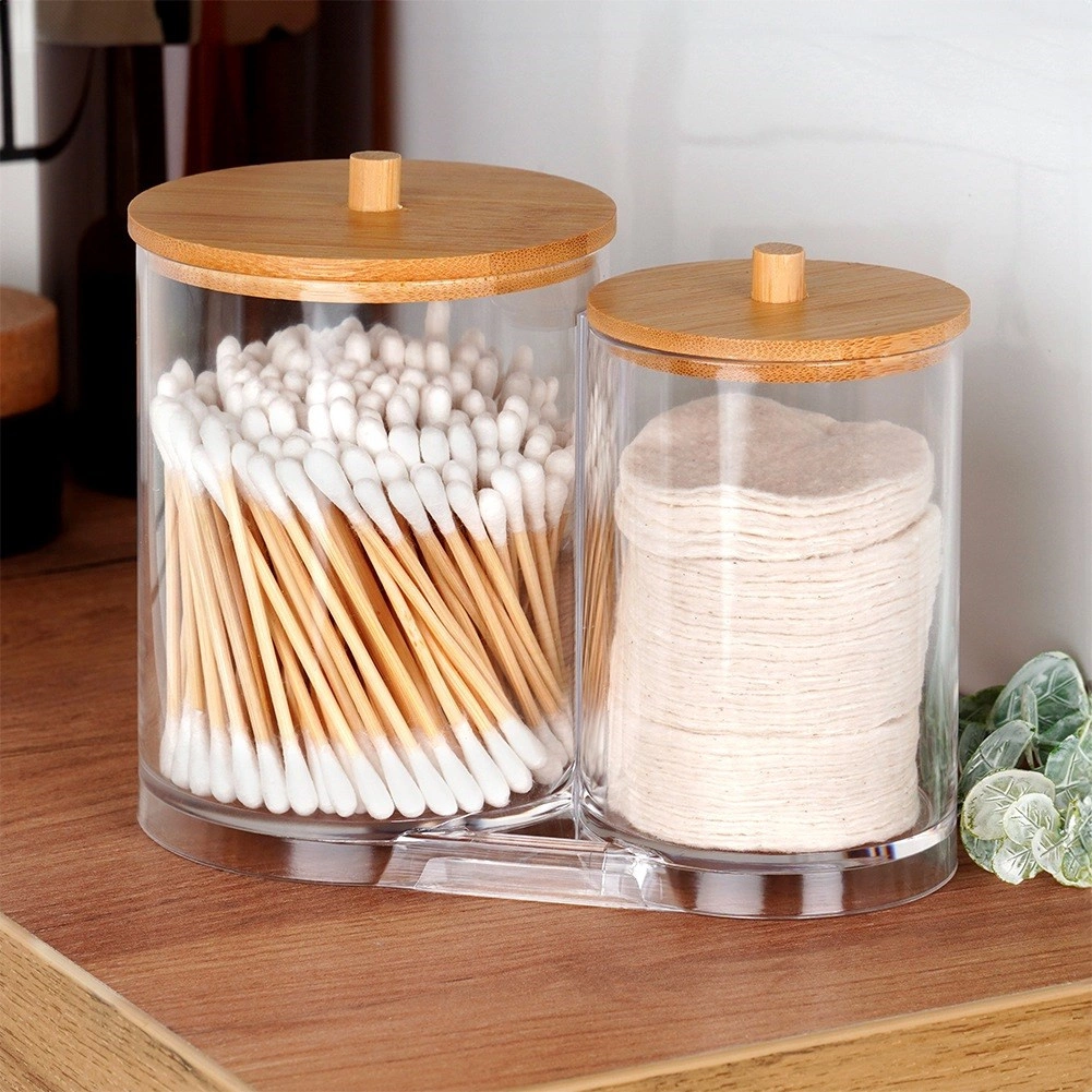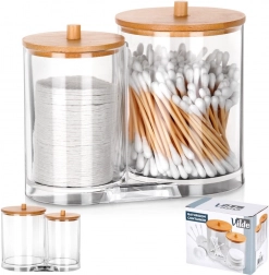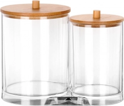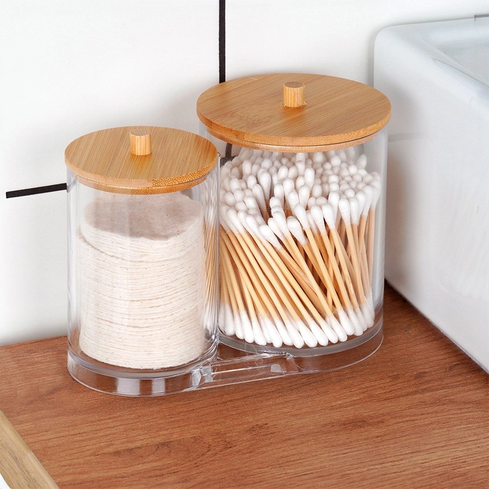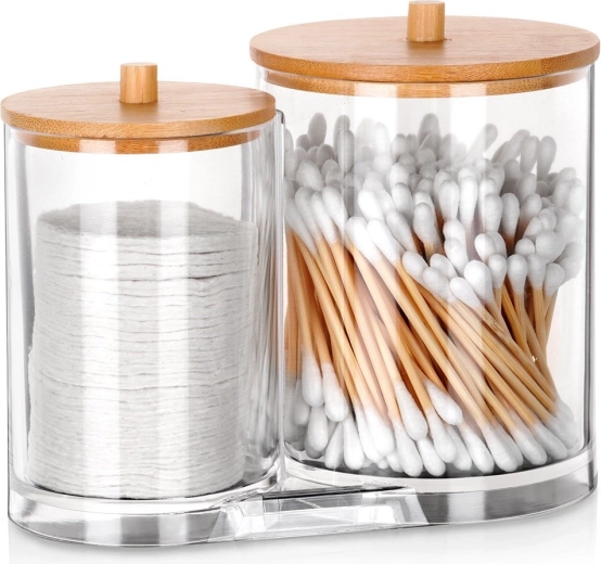 An elegant and functional solution for your daily bathroom routine. Two connected containers made from durable clear acrylic provide separate space for cotton swabs and makeup pads, keeping everything clean, accessible, and beautifully organized. Bamboo lids with practical handles protect the contents from dust and add a natural, modern look.