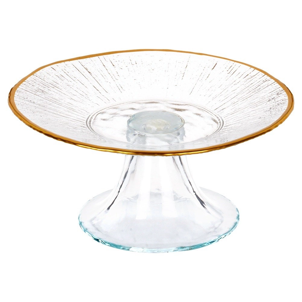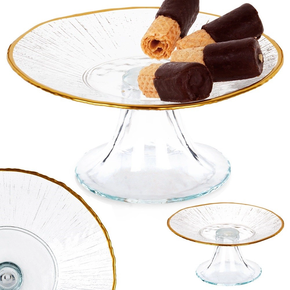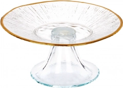 An elegant glass pedestal stand with a diameter of 15.5 cm featuring a gold rim and a crystal-like look for stylish serving. Ideal for desserts, cakes, fruit, and canapés. Thanks to its stable base, it beautifully highlights your treats and decorates any table.
