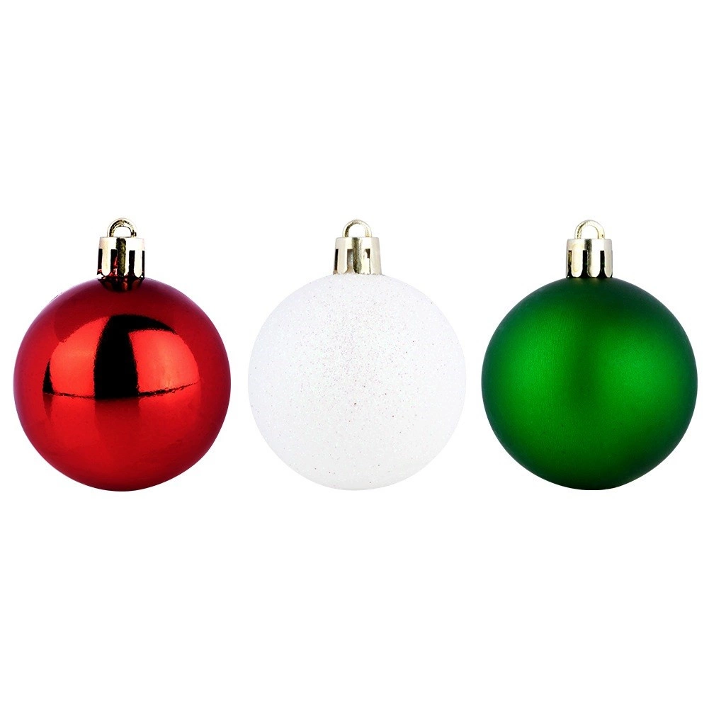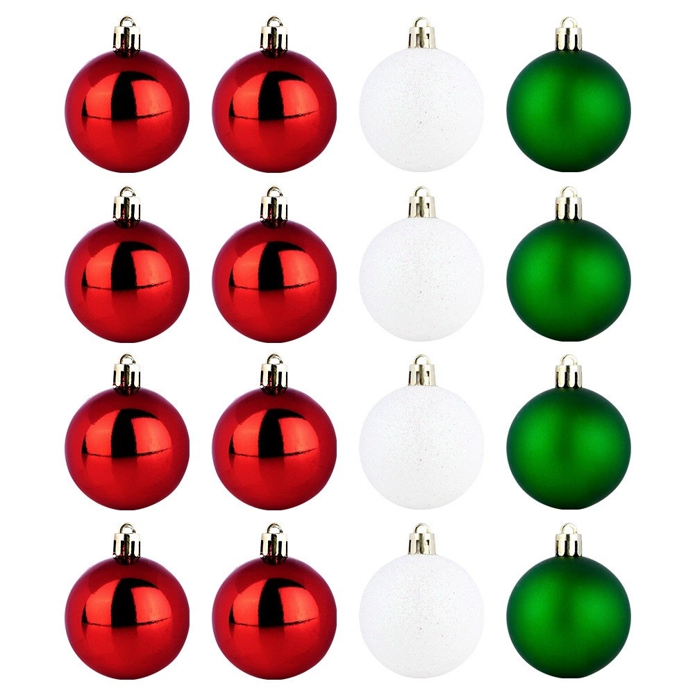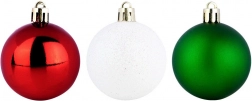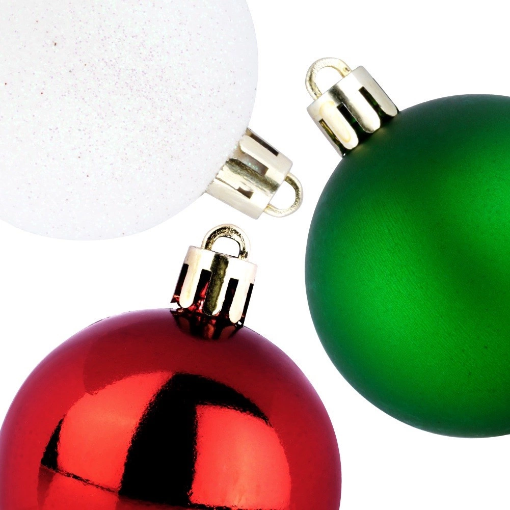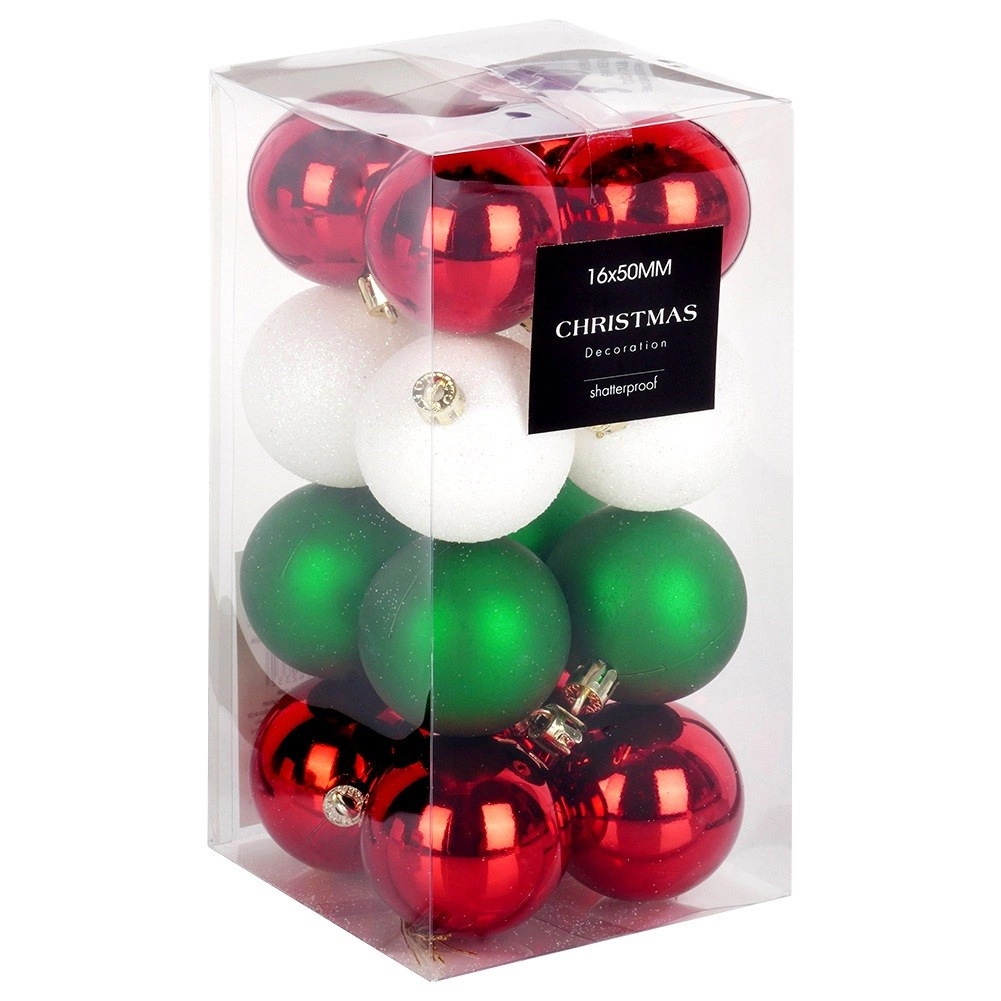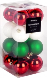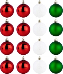 Set of 16 shatterproof Christmas baubles in red, green and white brings a classic shine and a magical holiday atmosphere to your decor. Each ornament has a diameter of 5 cm, featuring glossy, matte, and glitter finishes. Made from durable plastic – safe for kids and pets.