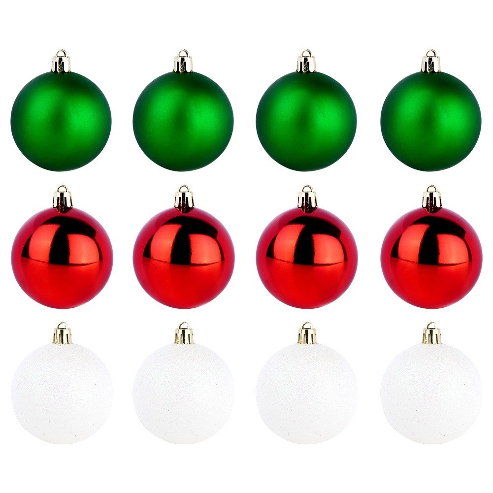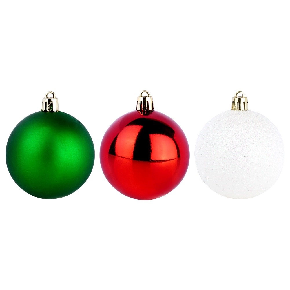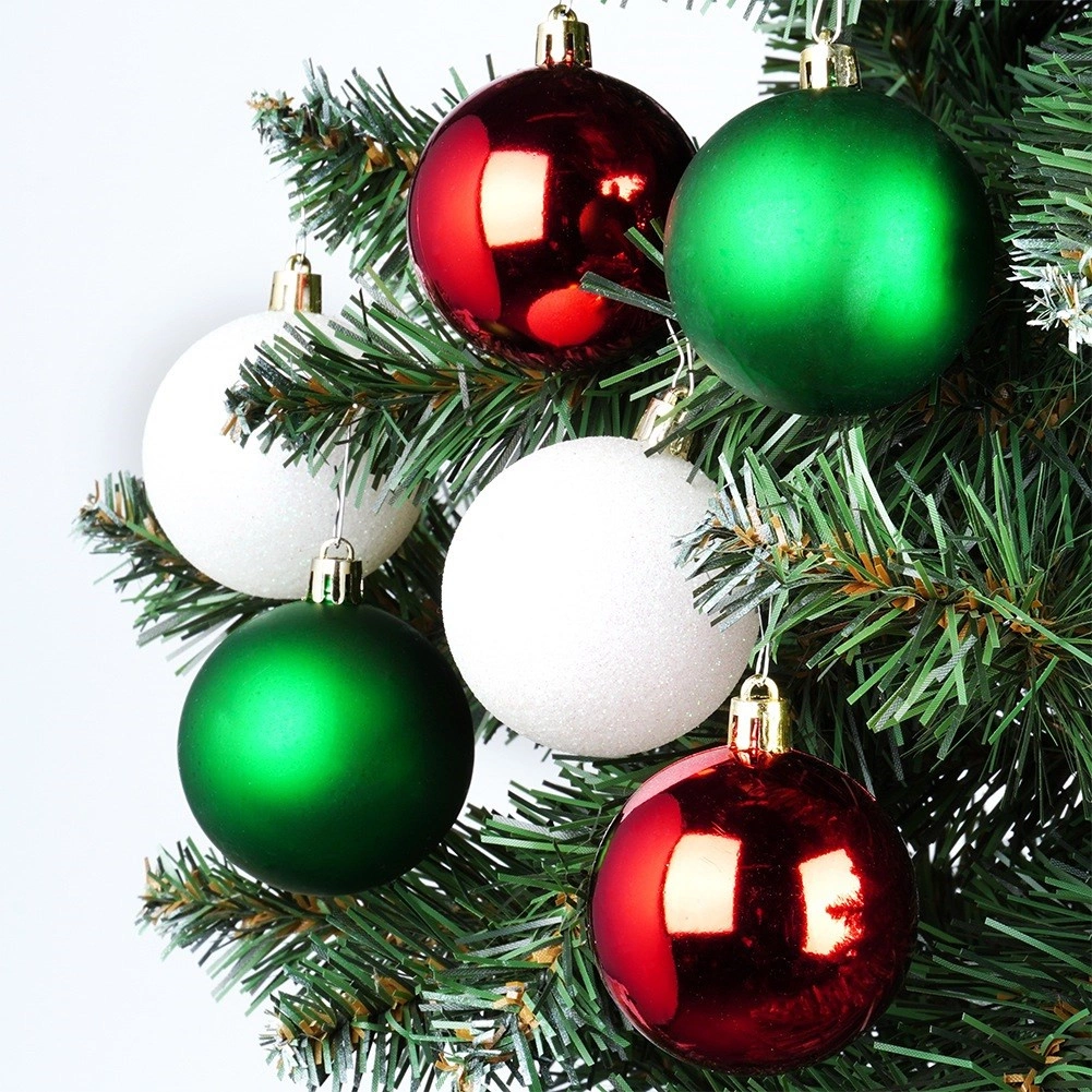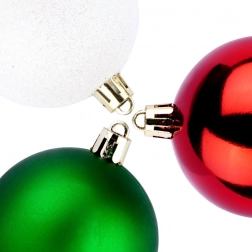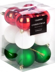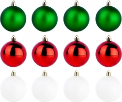 Dress your tree in classic holiday colors. This set includes 12 baubles with a diameter of 6 cm: 4× glossy red, 4× matte green and 4× white glitter. Thanks to the mix of finishes, the decorations add depth, contrast and elegance that suit both modern and traditional interiors.