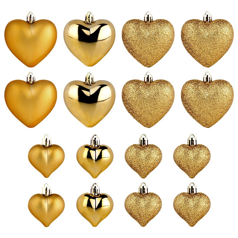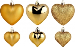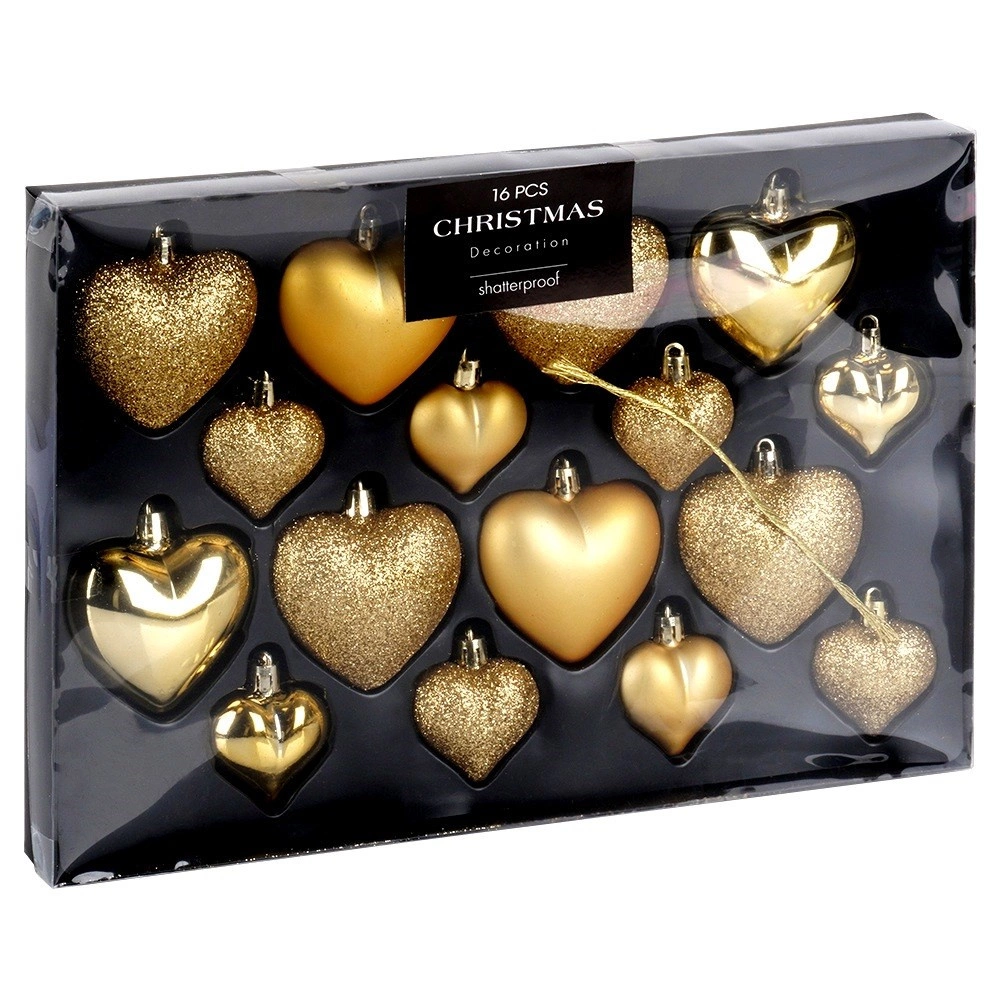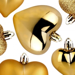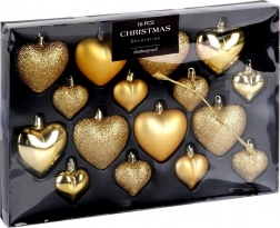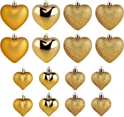 Elegant set of 16 gold heart-shaped Christmas ornaments in matte, gloss and glitter finishes. Thanks to the shatterproof material, they are safe for households with children and pets. Two sizes, 6.5 cm and 4.5 cm, allow harmonious decorating of the Christmas tree, wreaths and garlands and create a magical holiday atmosphere.