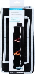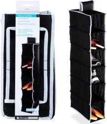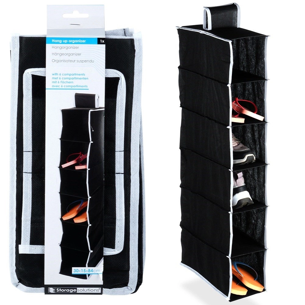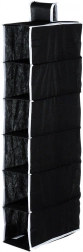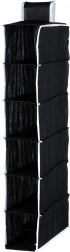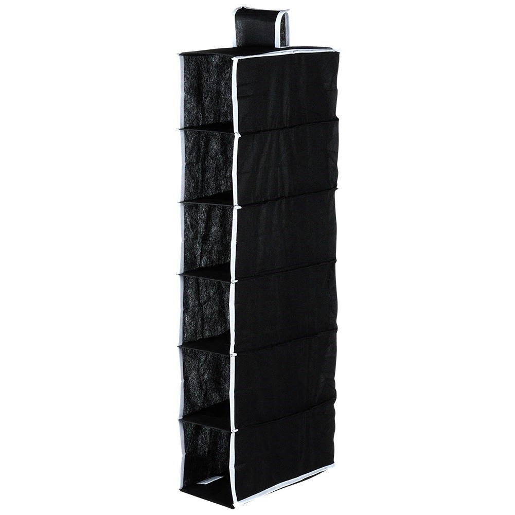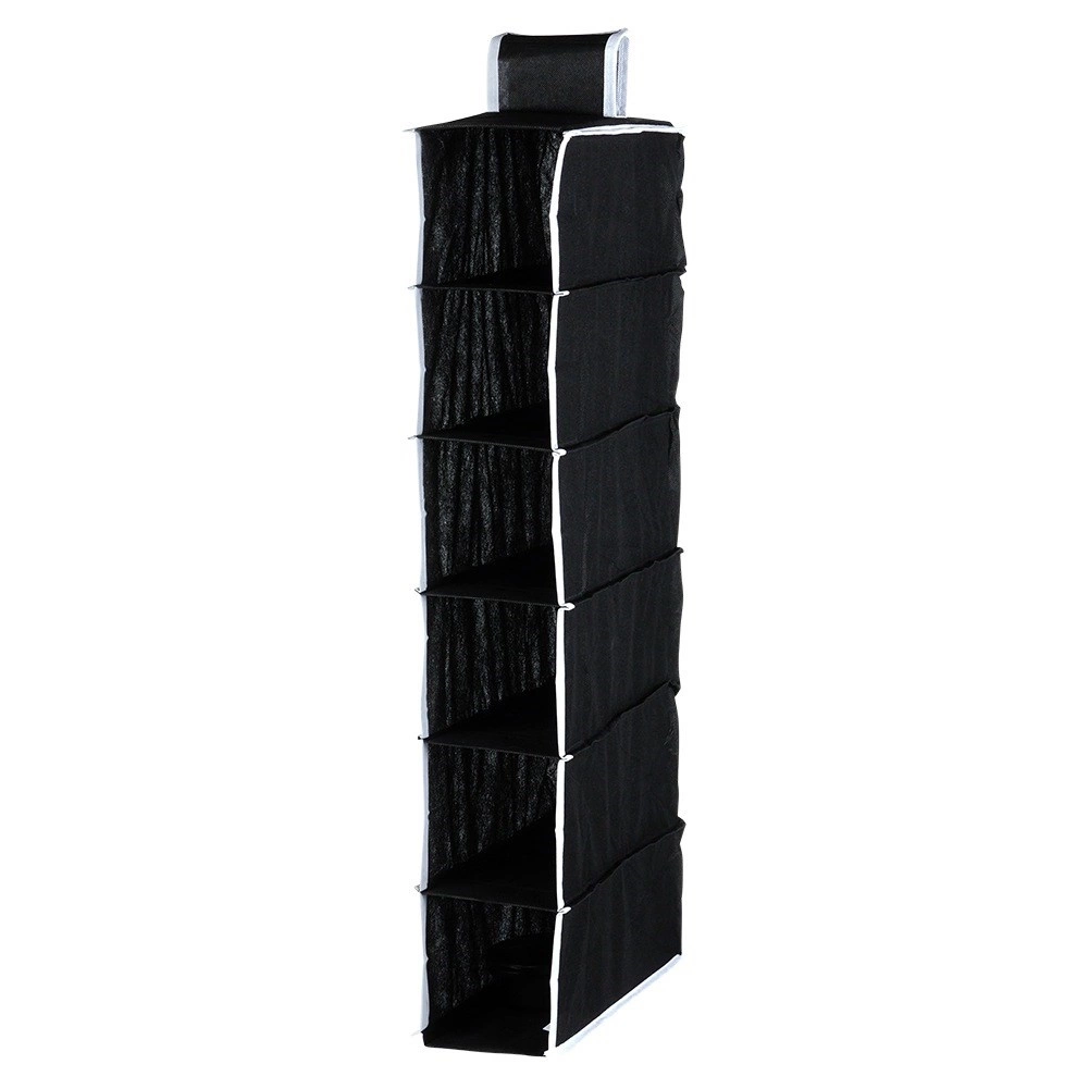 Maximize storage space in your closet with this compact hanging organizer offering 6 spacious shelves for tidy storage of shoes, T-shirts, towels, or fashion accessories. The black finish with contrasting trim looks modern and universal in any interior.
