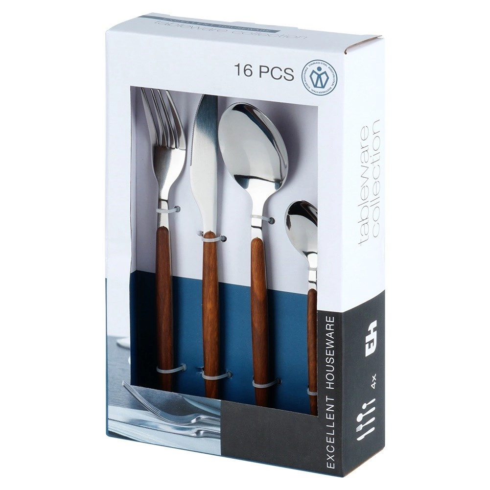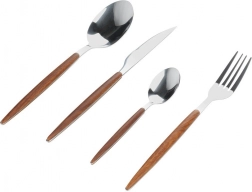 An elegant cutlery set for 4 people made of high-quality stainless steel with a glossy finish, complemented by ergonomic handles with a wood-look design. The package includes 16 pieces for everyday dining as well as festive occasions. The cutlery is durable, comfortable to hold, and dishwasher safe.