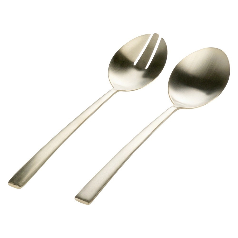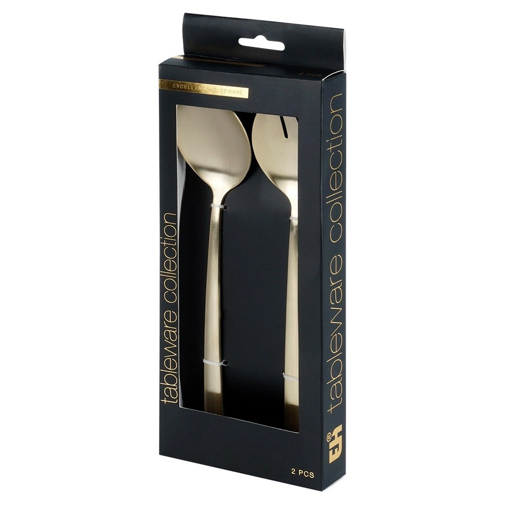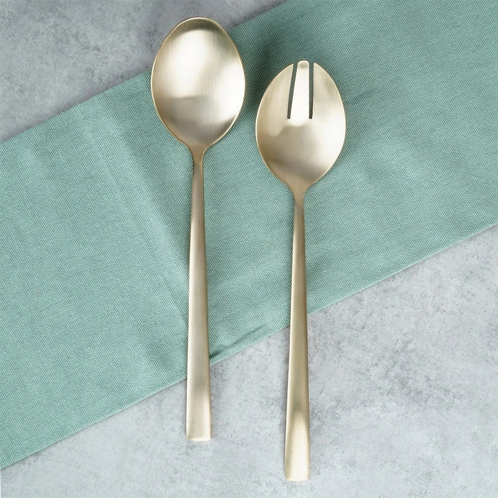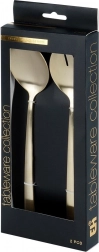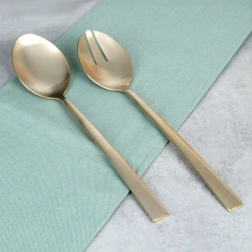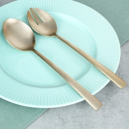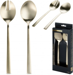 A set of 2 stylish salad spoons in a popular gold finish brings a touch of elegance to your table. The satin-brushed surface combines a gentle sheen with a subtle matte look, creating a modern appearance suitable for any interior.
