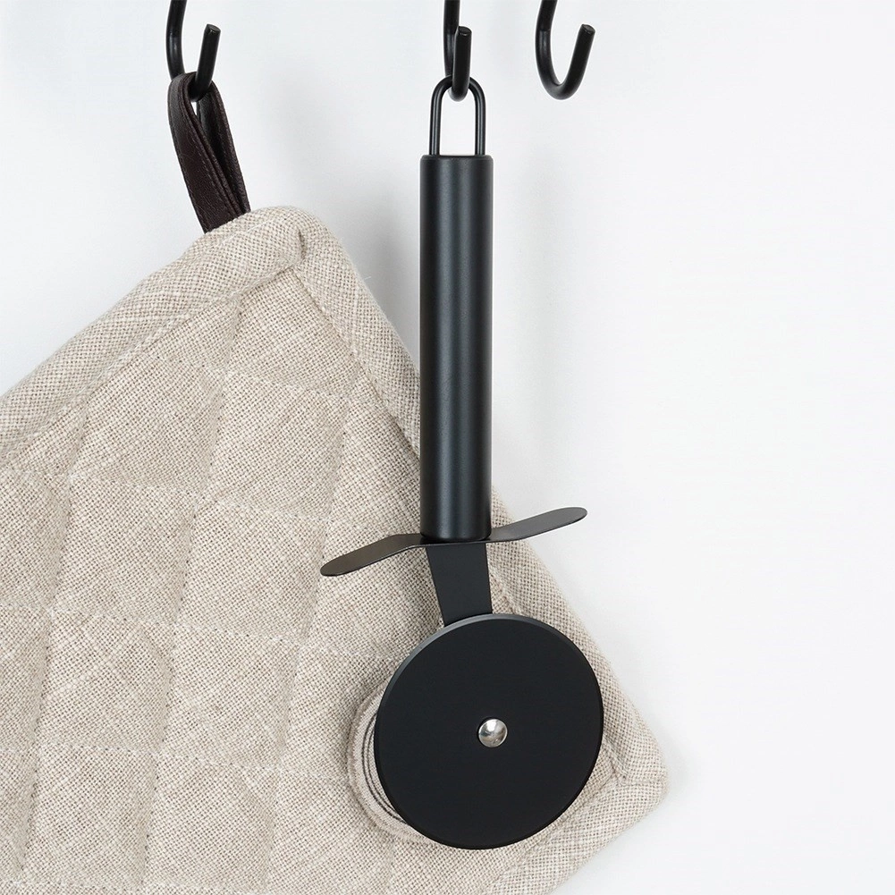 Practical pizza cutter with a rotating wheel for quick, clean slicing. Made of durable stainless steel with a matte black finish, it offers a sharp, precise cut, an ergonomic handle, and a hanging option. Dishwasher safe.