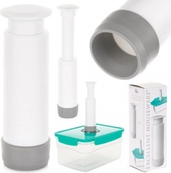 A compact hand vacuum pump, 13.5 cm long, for quickly extracting air from vacuum bags and containers. By creating a vacuum seal, it helps keep food fresh longer, preserve flavor, vitamins, and nutrients, and reduce food waste. Lightweight, ergonomic, and easy to use; the rubber base ensures a tight seal and stability during use.