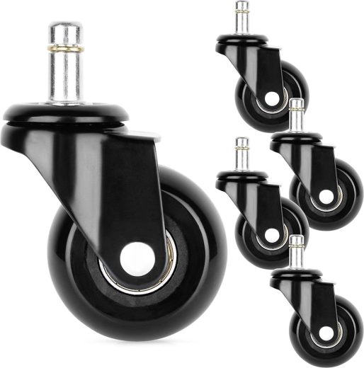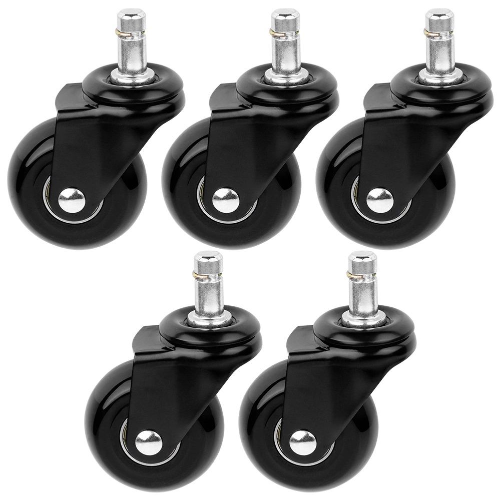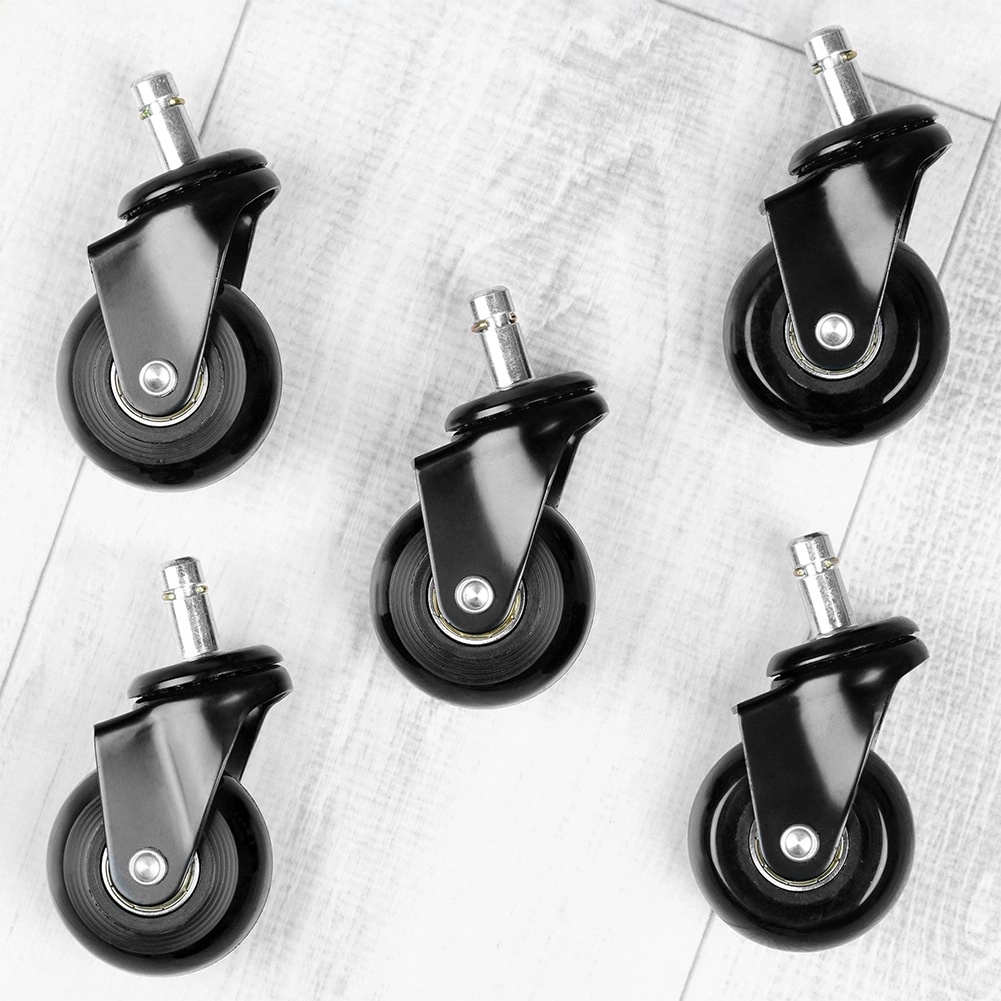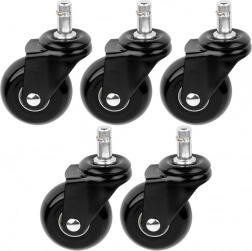 This practical set of five replacement casters for office chairs delivers quiet, smooth movement on hard floors. The rubber surface minimizes noise and vibrations while protecting floors from scratches. With a 50 mm wheel diameter and a 10 mm metal stem, they suit a wide range of chairs.