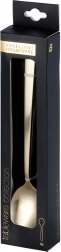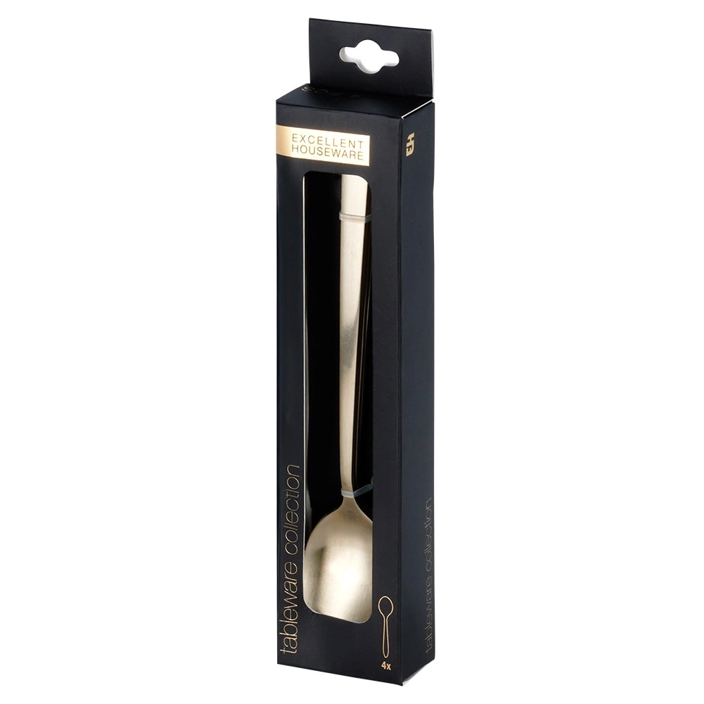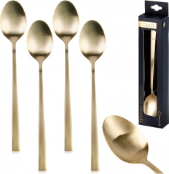 A stylish set of four long cocktail spoons made of stainless steel with a gold satin finish. Ideal for lattes, cocktails, desserts, and drinks in tall glasses. The spoons measure 3 × 18 cm, are food-safe, and dishwasher safe.