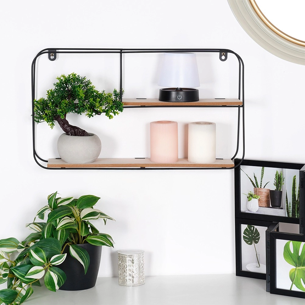 Two shelves provide ample space for souvenirs, candles, and small plants—everything neat and within reach.