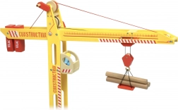 The set includes poseable crane operator and worker figures, a platform, a magnetic hook, various cargo, and traffic signs to mark off the worksite — a total of 12 accessories. Quality materials (solid wood, durable plywood, metal parts) and non-toxic paints ensure long-lasting, safe fun.