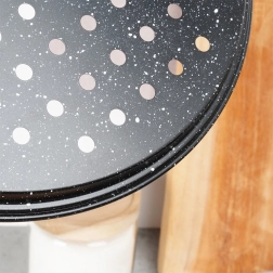 Bake homemade pizza with a perfectly crispy bottom. The perforated base ensures better air circulation and faster steam release, so the dough cooks evenly and stays delightfully crisp. The non-stick granite coating minimizes burning even with a small amount of fat and makes cleaning easier.