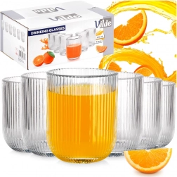 An elegant set of six 250 ml glasses made from high-quality, clear, ribbed glass. Stylish ribbing ensures a better grip and a modern look. The glasses are versatile for water, juices, lemonades, and drinks and are dishwasher-safe. Ideal for everyday use at home and in food service.
