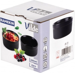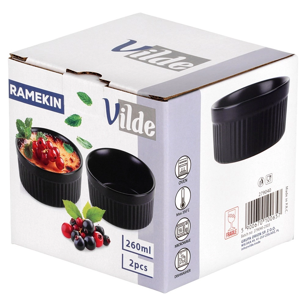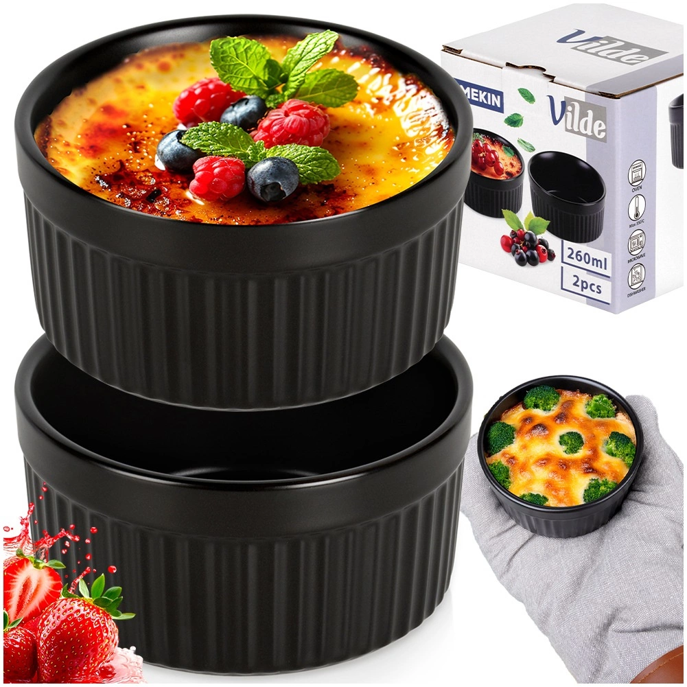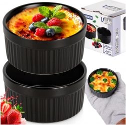 Versatile black ramekins are an indispensable helper for everyday cooking and festive serving. Thanks to the quality porcelain glaze, they are heat-resistant up to 350 °C and suitable for the oven, microwave, and dishwasher. The matte-looking ribbed design and compact dimensions of 10 × 5 cm add style to your table.