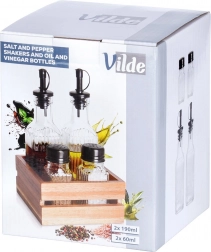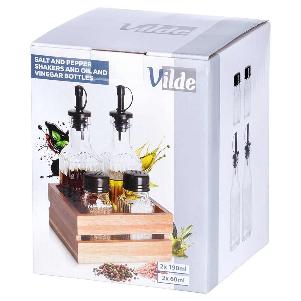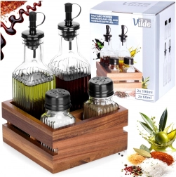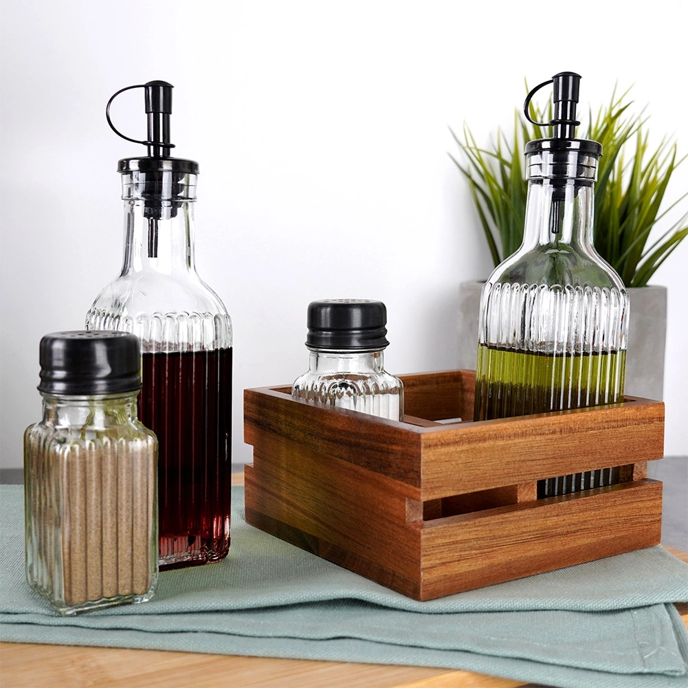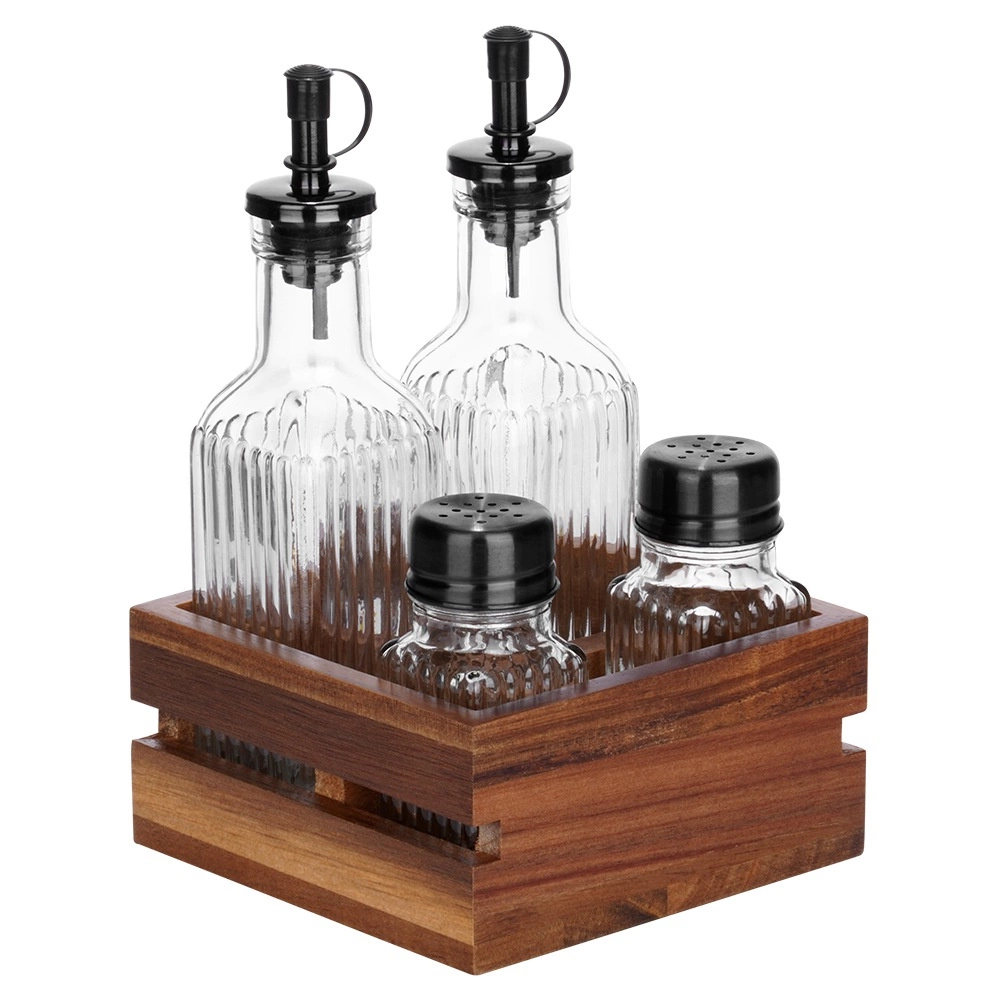 Design and materials: the bottles and shakers are made of glass with effective ribbing; shaker lids in black metal, dispensers in black durable plastic; stand made of acacia wood for stability and long life.