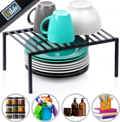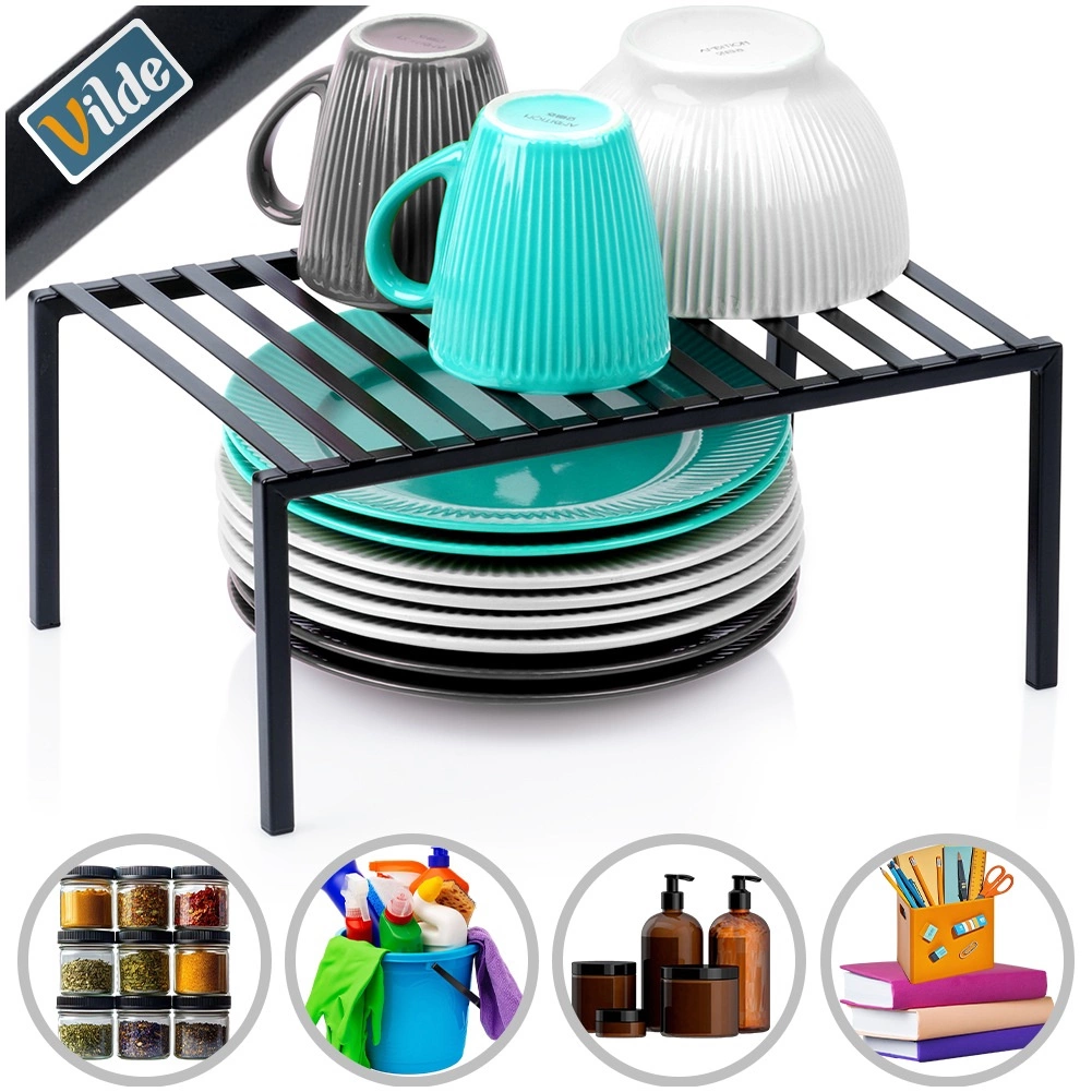It divides the height of a shelf or countertop and allows you to neatly store plates below and mugs or bowls above.