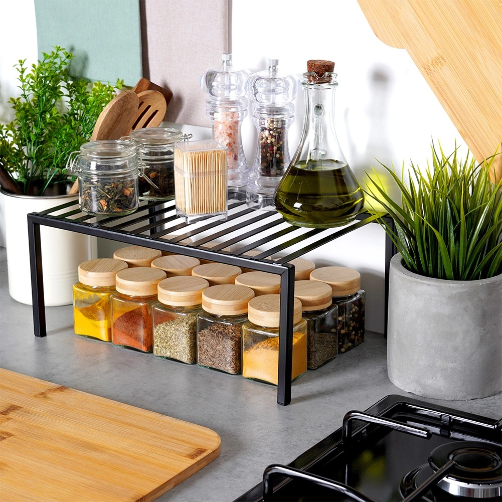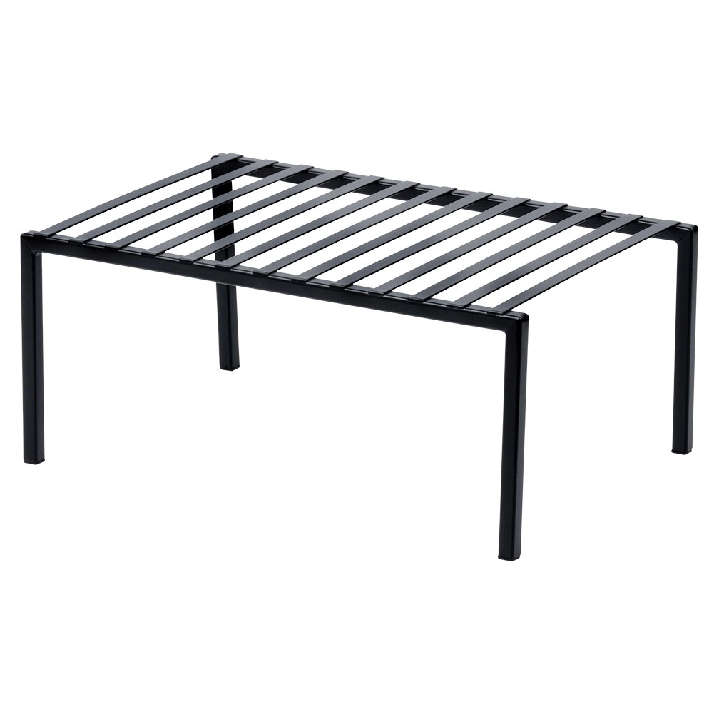 This versatile black metal shelf efficiently divides the height of a cabinet or the surface of a countertop into two tiers, giving you more storage space without any additional modifications. Thanks to its solid build, it is stable and reliable for everyday use.