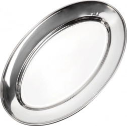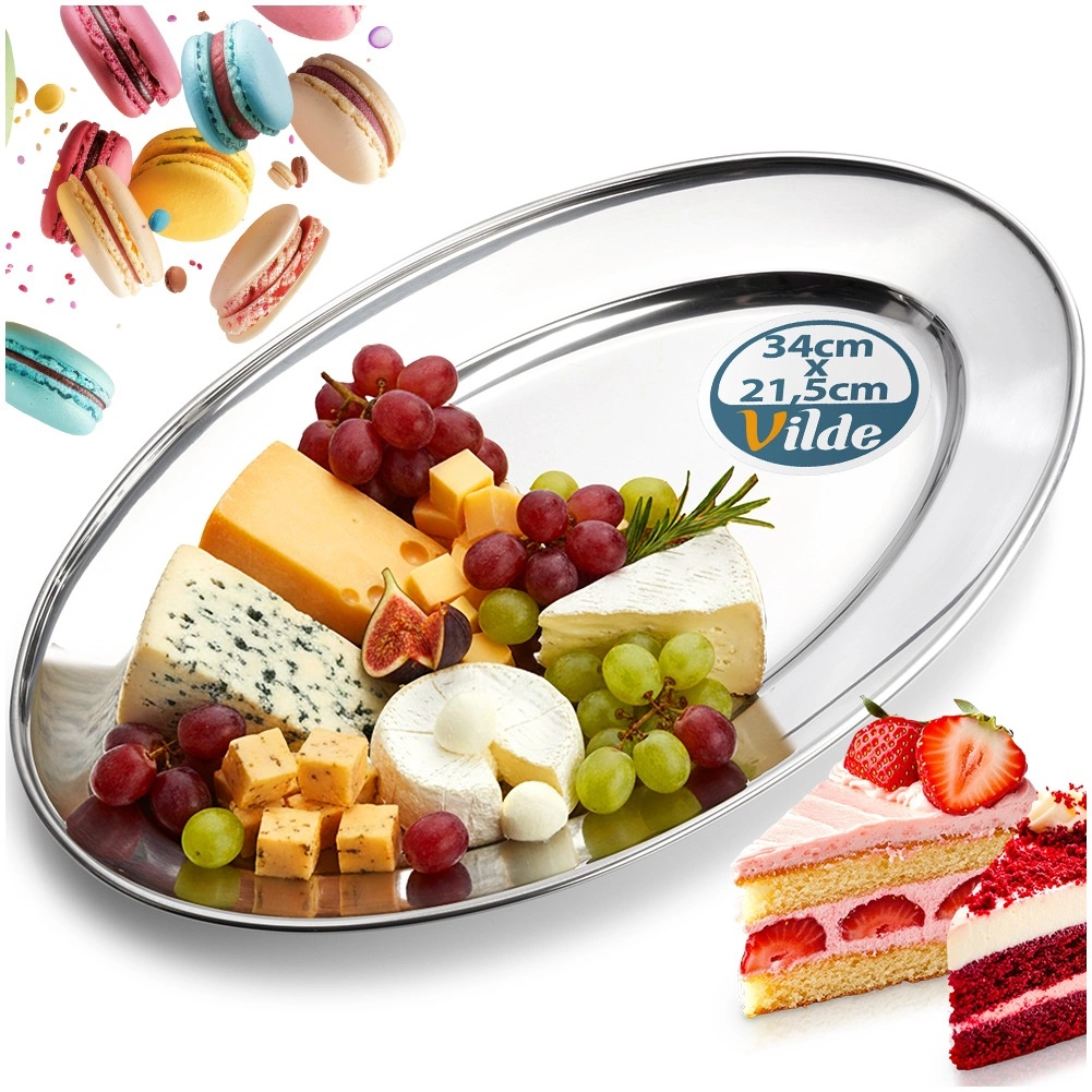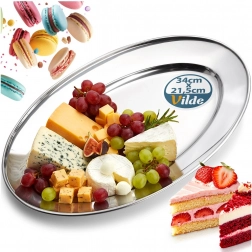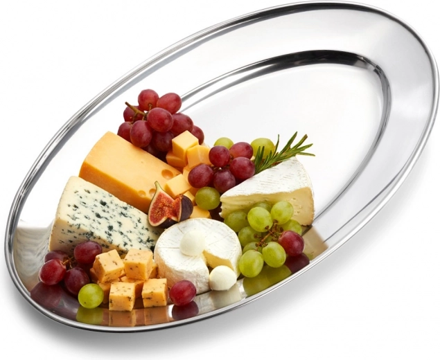 An elegant oval tray made of stainless steel with dimensions 34 × 21.5 × 3 cm, ideal for serving appetizers, cheeses, fruit, and desserts. Thanks to its polished finish and high durability, it fits perfectly in the home and foodservice, bringing a timeless, stylish look to any table.