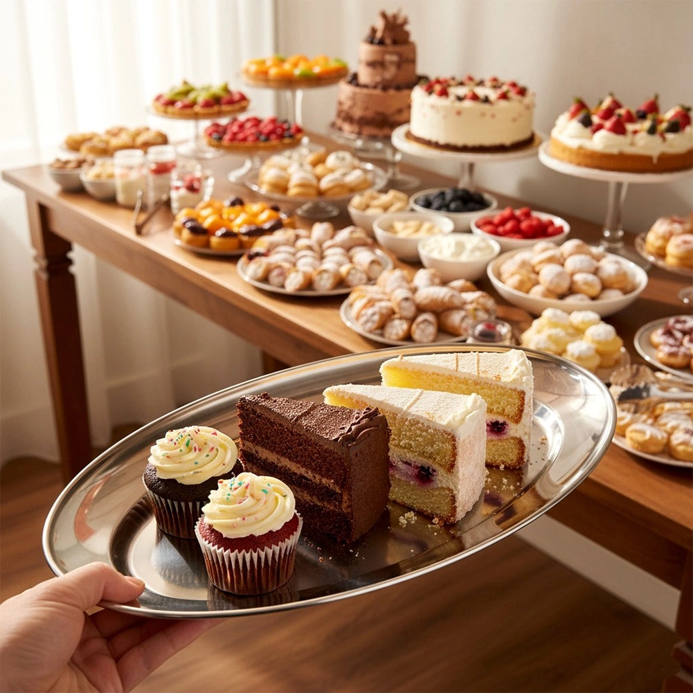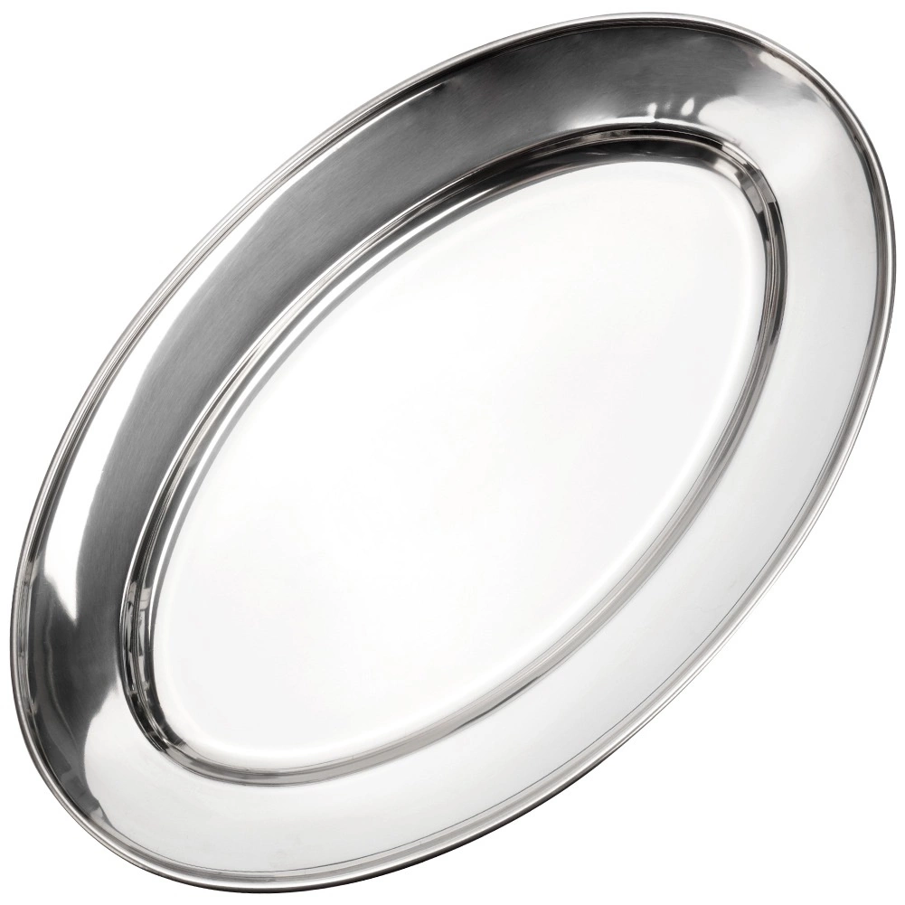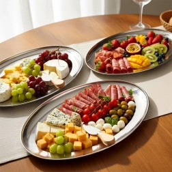 A stylish oval serving tray made of quality stainless steel stands out with its glossy, easy-to-clean surface and practical rim for safe carrying. It’s a great choice for everyday use and special occasions alike—from brunches to family celebrations.