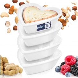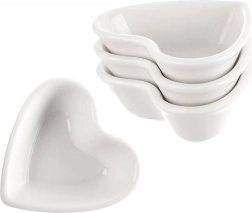 Elegant set of four white heart-shaped porcelain bowls with a capacity of 35 ml and dimensions 7.5 × 7.5 × 2.5 cm. Ideal for serving snacks, dips and sauces, and mini desserts. Heat resistant up to 200 °C, suitable for use in the oven, microwave, and dishwasher. The classic white design fits any home or professional setting.