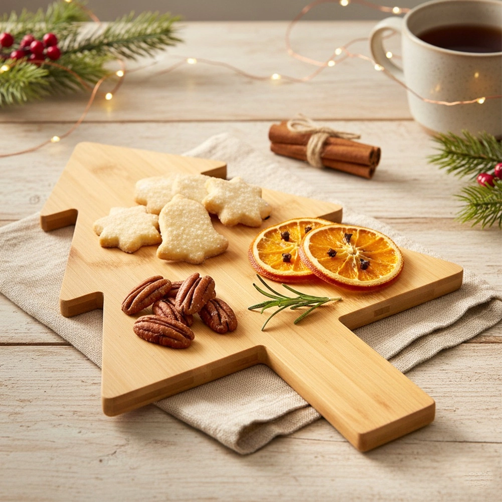 Stylish bamboo board in the shape of a Christmas tree measuring 44.5 × 30 cm, ideal for serving cheeses, cold cuts, fruit, and sweets. Made from sustainably sourced bamboo, it is moisture-resistant and easy to clean. A perfect choice for winter and holiday dining.