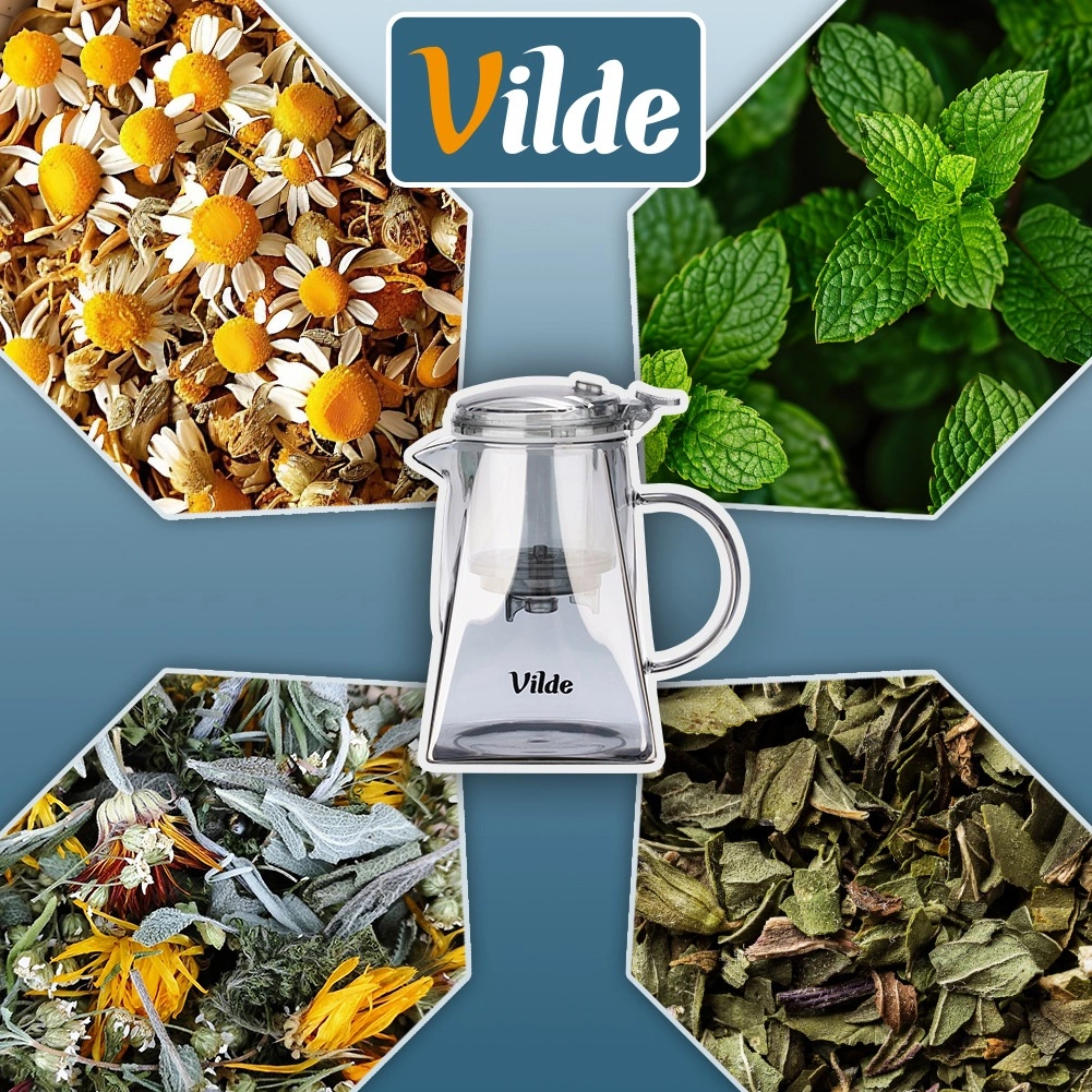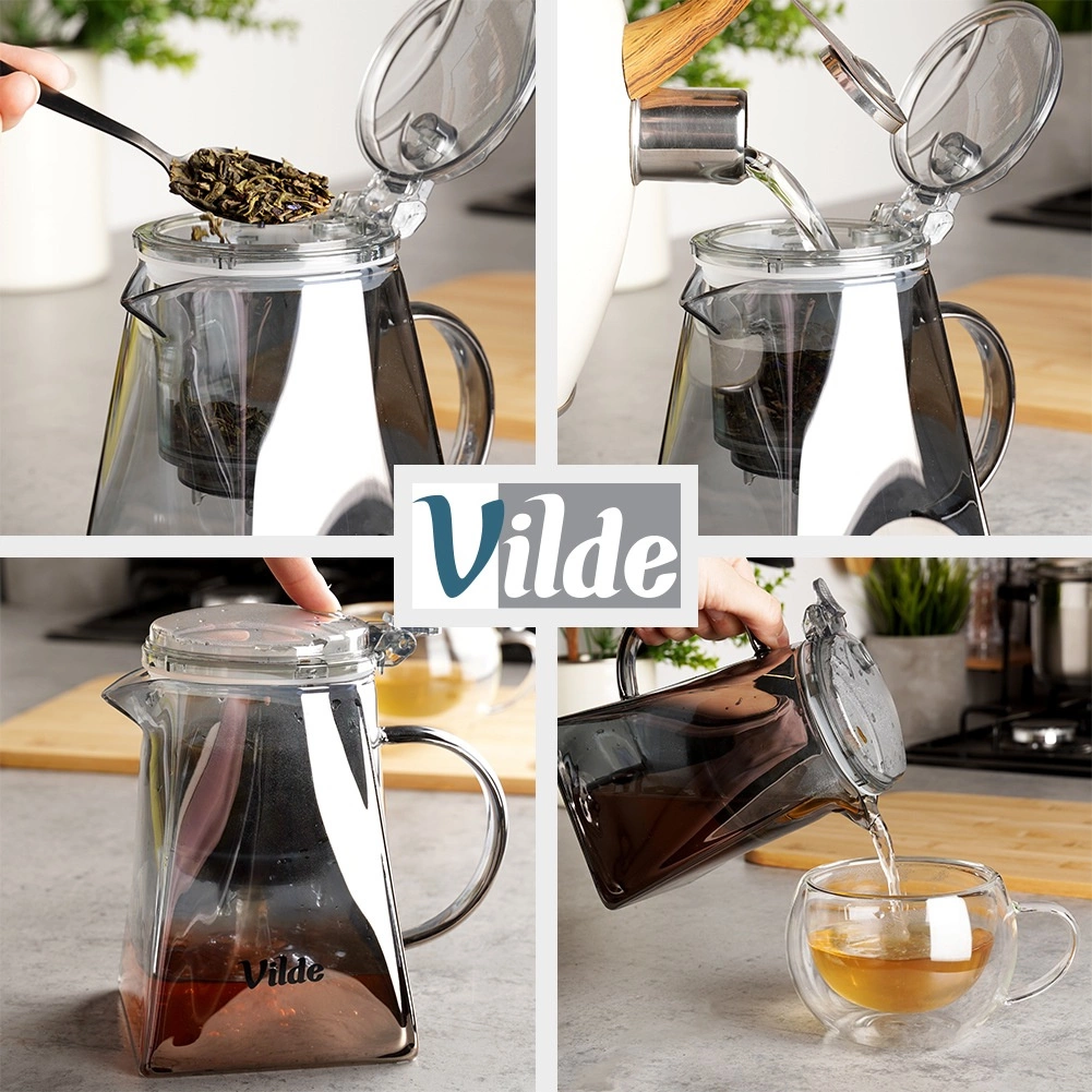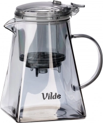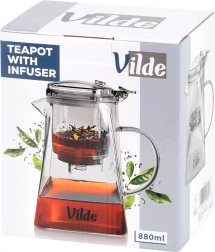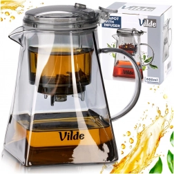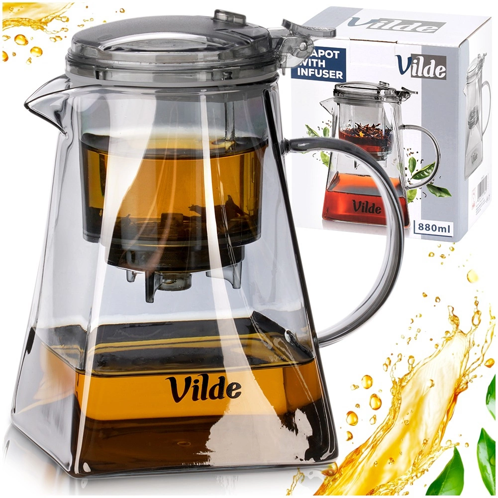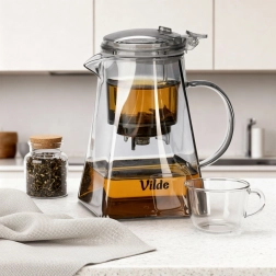 The teapot is made of heat-resistant borosilicate glass, while the infuser and lid are made of durable plastic in a smoke-tinted transparent finish. The practical wide opening makes pouring and cleaning easy, and the ergonomic handle ensures safe handling. The square base gives the pot a distinctive look and stability on the table.