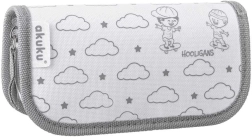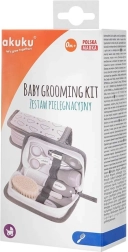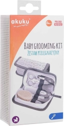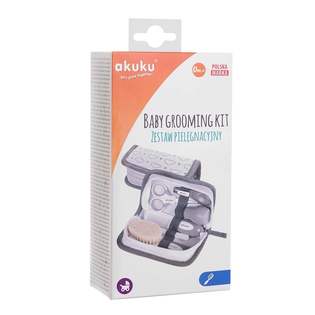 The practical Akuku Hooligans baby care starter set in a textile case is ideal for newborns and as a gift. It includes everything needed for safe hygiene and grooming of nails and hair – scissors with rounded tips, nail clippers, a file, a soft brush with natural bristles, a comb with a non-slip handle, and a nasal aspirator with a soft tip. BPA-free.