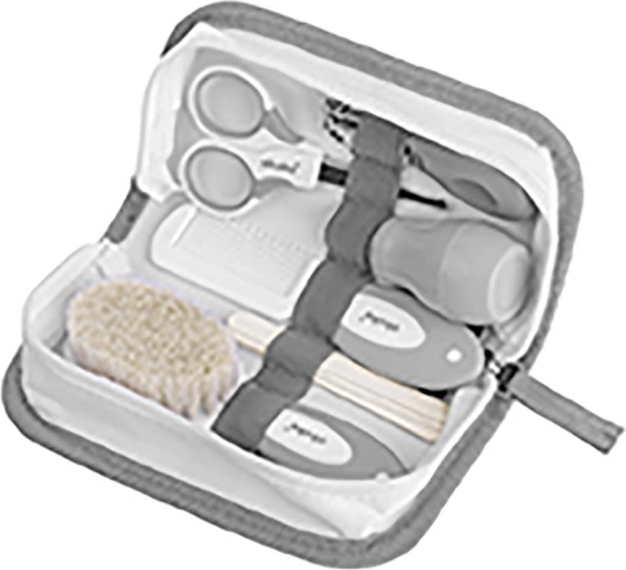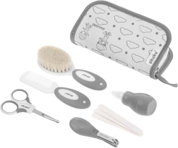 Scissors with rounded tips, nail clippers, nail file, brush with natural bristles, comb with non-slip handle, nasal aspirator with soft tip