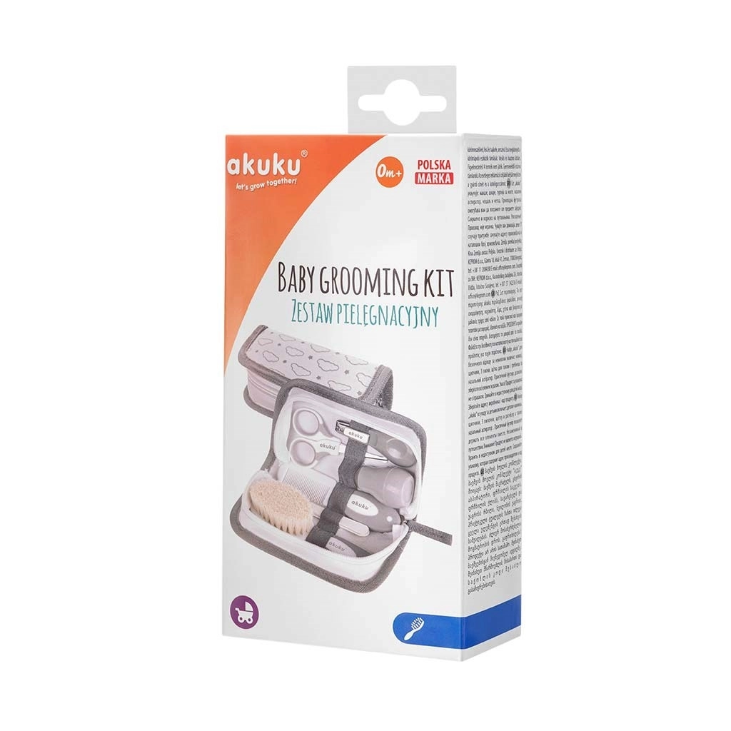 The complete Akuku Hooligans set makes everyday baby care easier from day one. All tools are designed with safety and comfort in mind – scissors with thin metal blades and rounded tips for gentle trimming, clippers and a file for smooth nail edges without the risk of scratching. The brush with soft natural bristles gently cares for the sensitive scalp, while the comb with a non-slip handle ensures a secure grip.