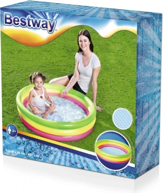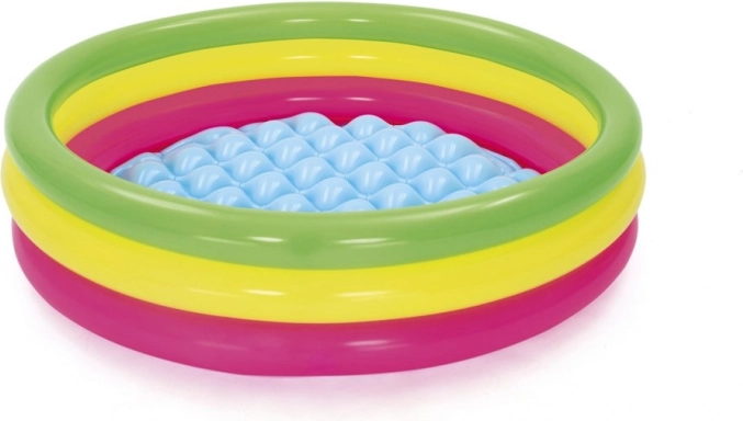 A lightweight, compact pool with a diameter of 102 cm and a height of 25 cm is an excellent choice for children aged 2 and up. Three colorful rings with separate valves provide stability and safety during play, while the inflatable floor offers extra comfort even on harder surfaces. The 62-liter capacity is just right for a pleasant cool-down and first water play.