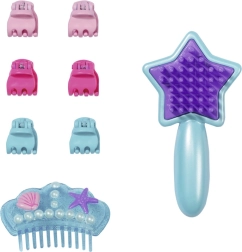 The long, colorful hair with quality strands can be repeatedly brushed and styled into new looks. There is a storage tray for accessories, holders for the star-shaped brush and shower head, a headband-comb, and 6 clips. The play encourages imagination, dexterity, and creativity, and entertains in the bath and beyond.