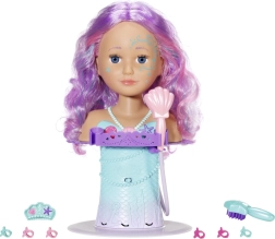 Turn bath time into a magical beauty salon with the BABY born Sister styling head in a mermaid design. Thanks to the suction cups, it easily attaches to the edge of the tub, where it delights with long, high-quality strands for endless hairstyles, an electronic shower with a pump, and plenty of accessories. It supports creativity, fine motor skills, and offers long-lasting fun while washing, brushing, and decorating hair.