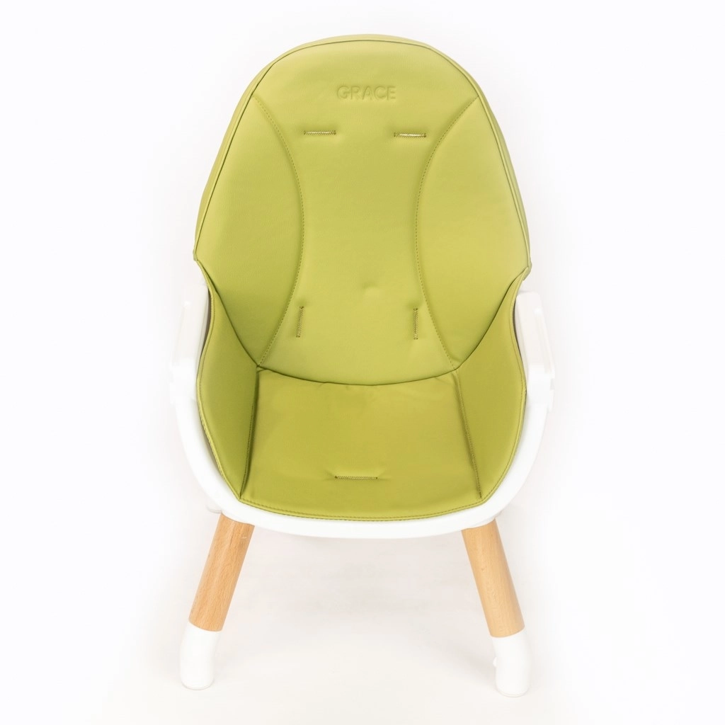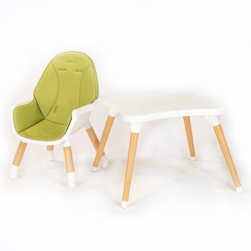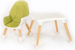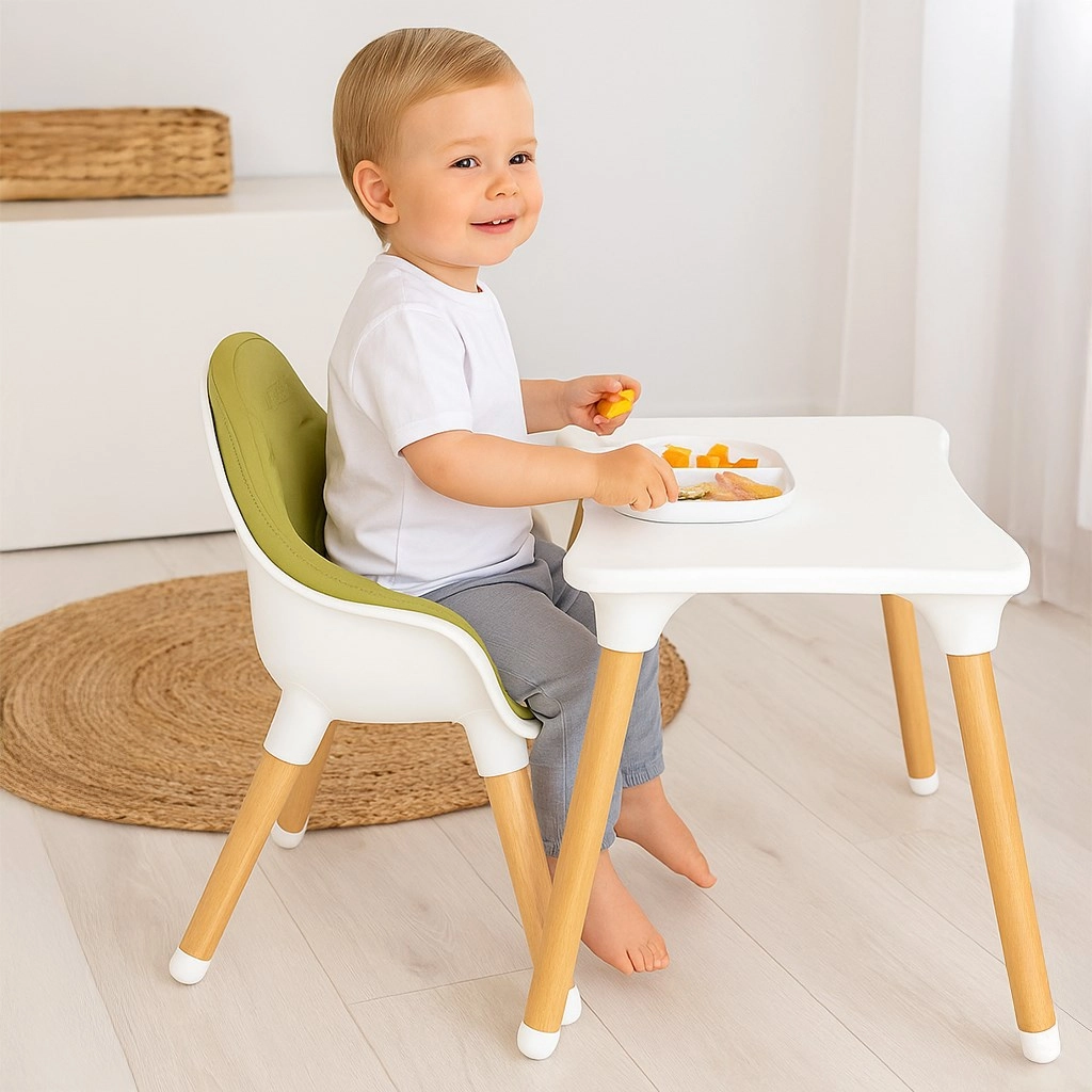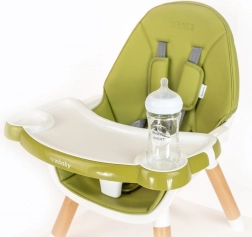 The modern 3-in-1 NEW BABY Grace high chair in elegant green combines a high chair, a low chair, and a table + chair set. It offers a stable construction, 5-point safety harness with soft pads, easy-to-clean eco-leather upholstery, and a removable tray with bottle/cup holders. Ideal from the first solids through to creative play and drawing.
