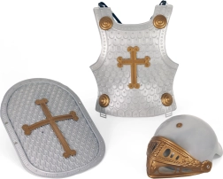The set includes everything little knights need to fulfill their heroic dreams – a sword with sheath, shield, helmet, and vest.