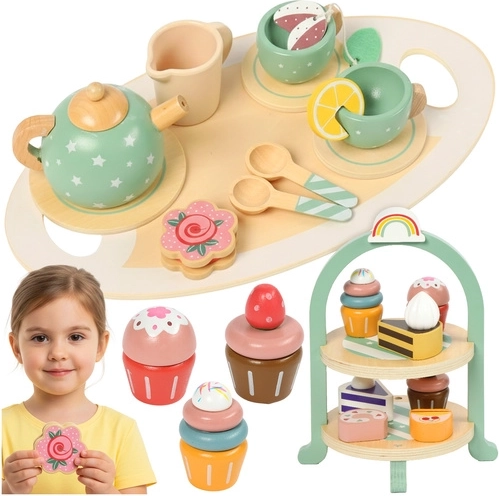 Turn every afternoon into a magical tea party! This wooden Kruzzel set with a stylish tiered stand introduces children to a world of confectionery imagination. It includes a teapot, cups, cutlery, and sweet desserts – all made of smooth, safe wood in soft pastel colors. It supports creativity, fine motor skills and social skills, is ideal from 3 years, and features durable workmanship and CE/EN71 certification.
