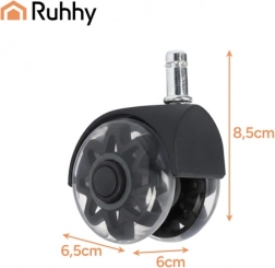 Replace old casters with modern, quiet RUHHY 2.5" wheels. They offer quiet operation (under 25 dB), smooth 360° movement, and floor protection without scratches thanks to the soft PU tread. A universal 11 × 22 mm stem and quick tool-free installation make them an ideal choice for laminate, hardwood, tile, and carpet.