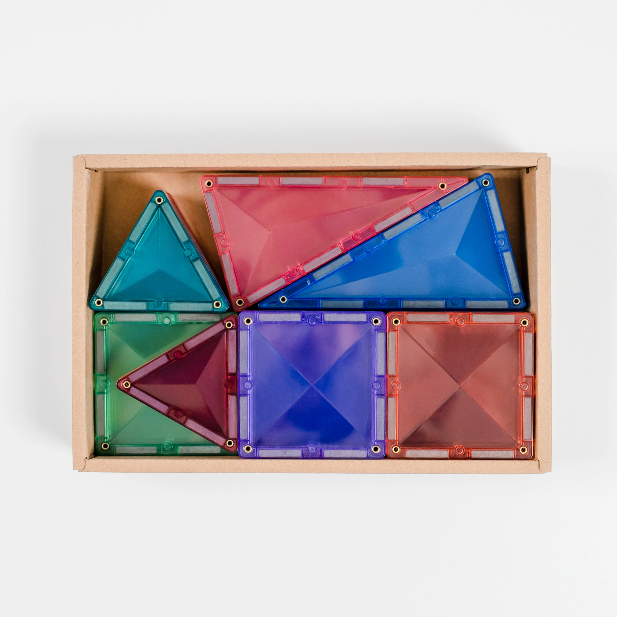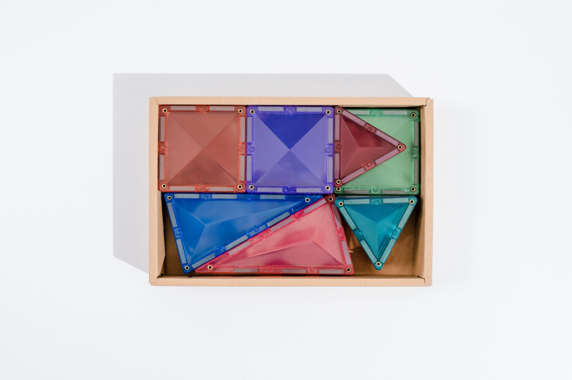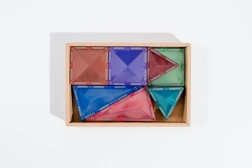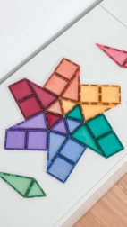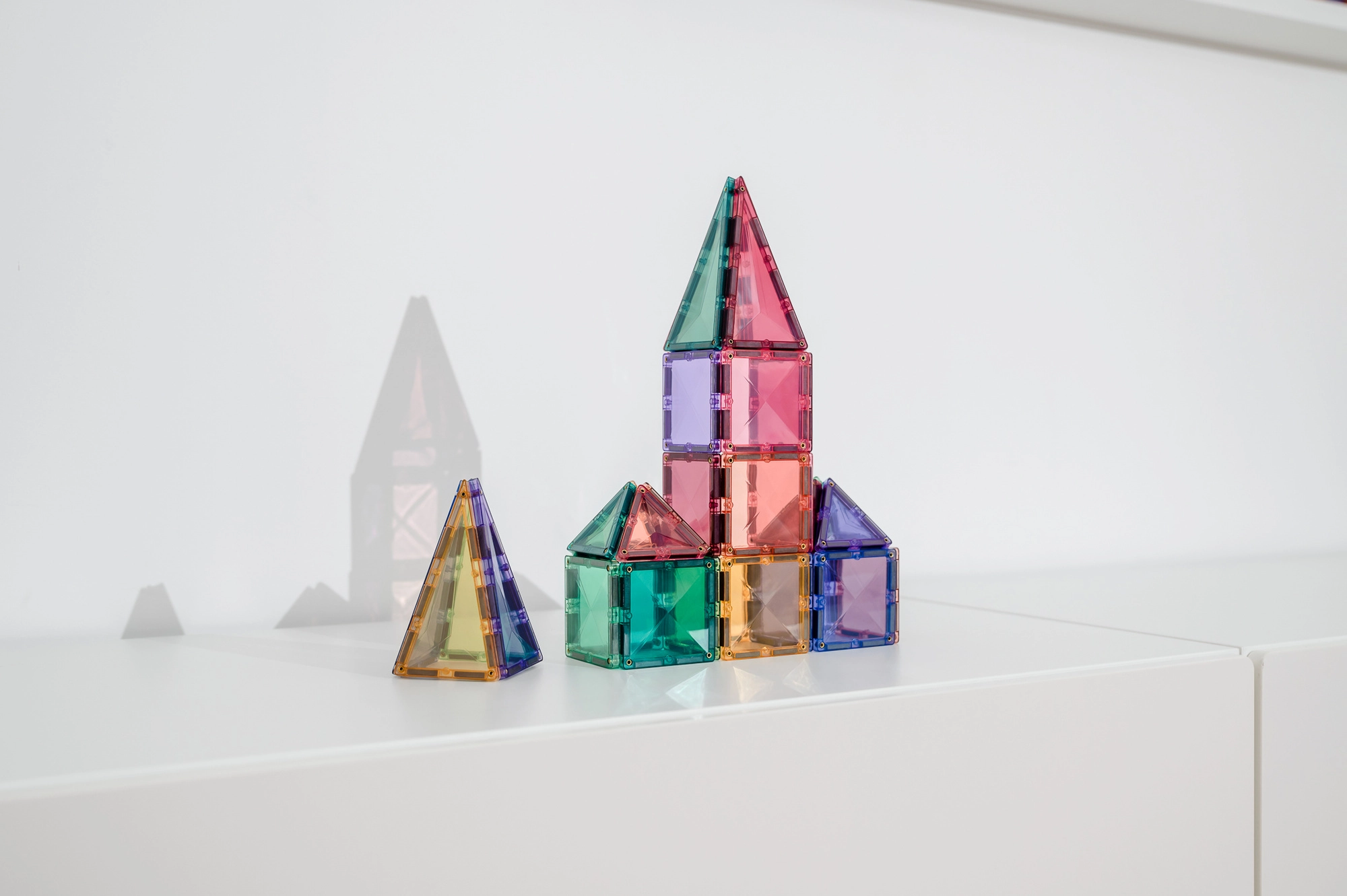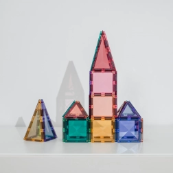 The set includes 16 small squares, 8 equilateral triangles, and 8 isosceles triangles plus an illustrated inspiration booklet. Thanks to compatibility with other CONNETIX sets, you can expand builds endlessly. The transparent colors beautifully let light through and encourage sensory play.