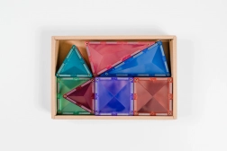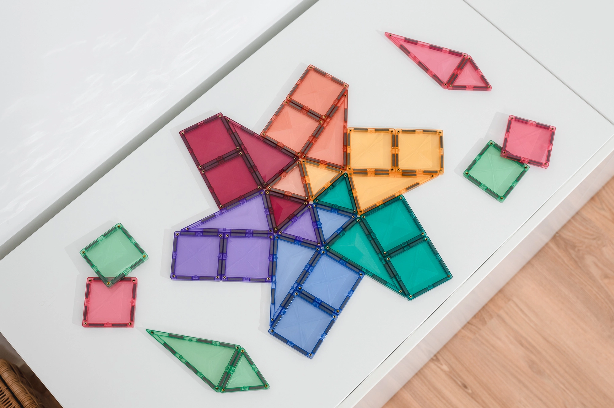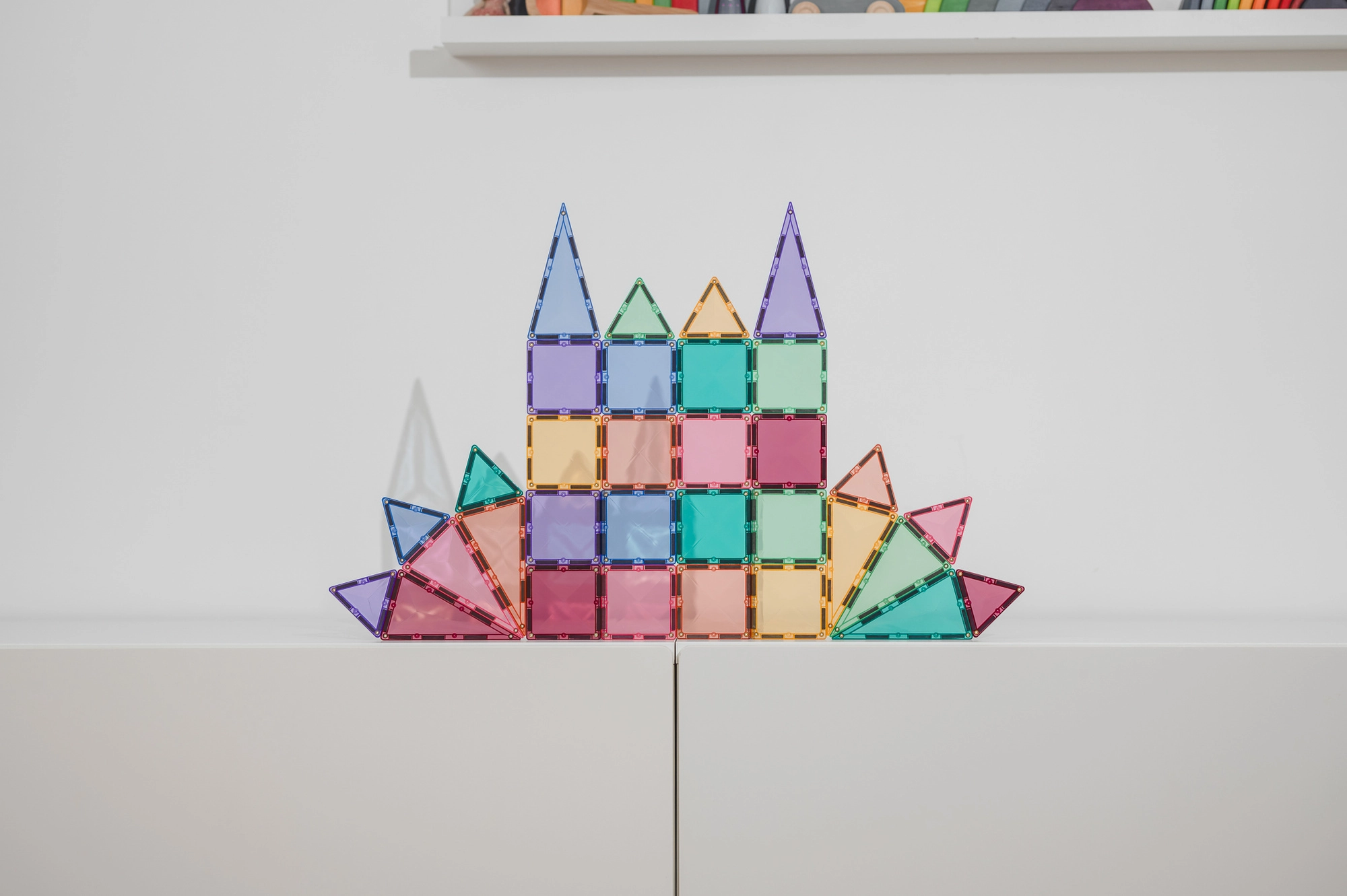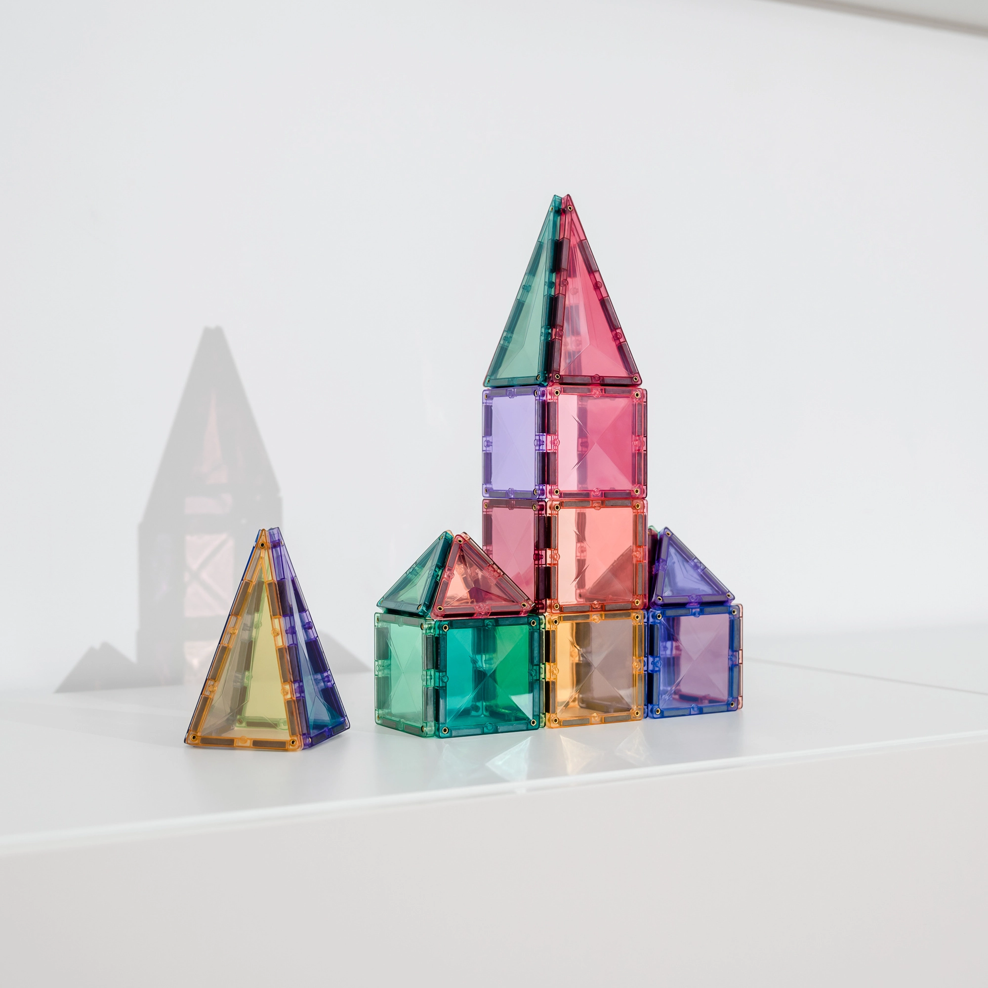 The set includes 16 small squares, 8 equilateral triangles, and 8 isosceles triangles plus an illustrated inspiration booklet. Thanks to compatibility with other CONNETIX sets, you can expand builds endlessly. The transparent colors beautifully let light through and encourage sensory play.