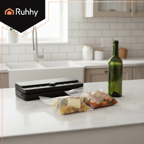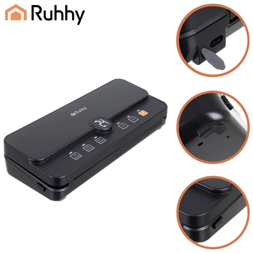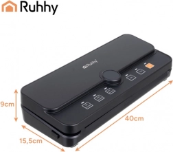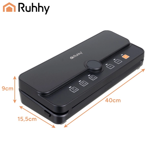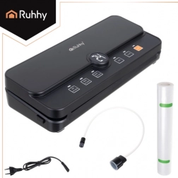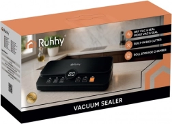 The practical and reliable RUHHY vacuum foil sealer is ideal for home food storage and sous‑vide preparation. Thanks to a strong vacuum up to -80 kPa and a high-performance 9 l/min pump, it removes air in seconds and creates a strong, even seal. The integrated roll holder and sliding cutter let you make bags of any length without scissors, saving time and space.