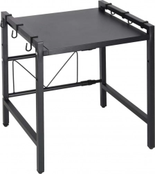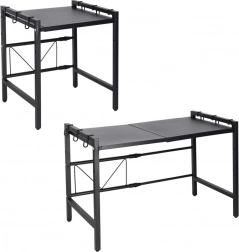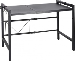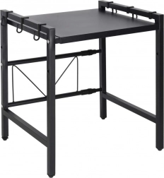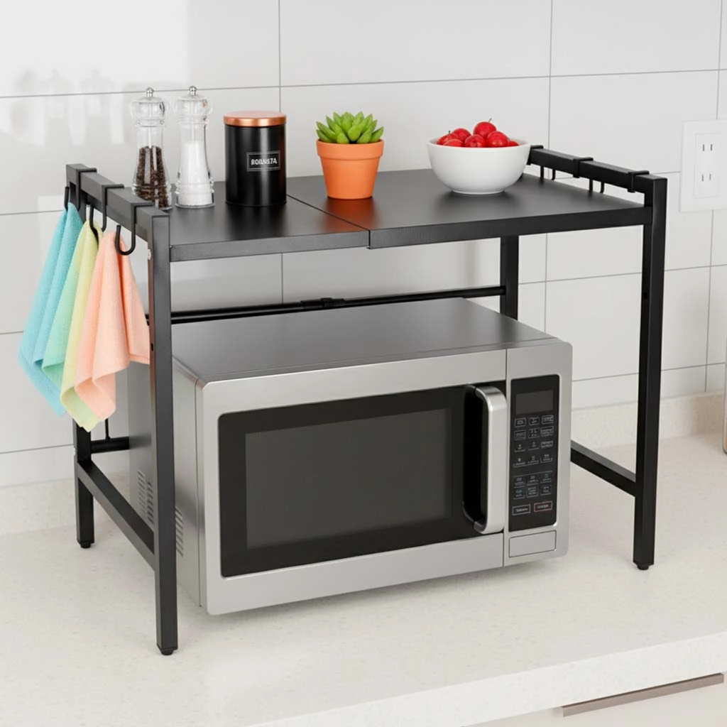 A practical, stable kitchen shelf over the microwave made from durable steel adds more counter space. It is extendable, has adjustable shelf height, and includes 6 hooks for accessories. The powder‑coated surface resists moisture and scratching, and the shelf holds up to 30 kg at the minimum width.