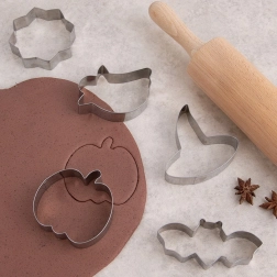 Use the cutters not only for dough, but also for fondant, marzipan, or linzer dough, and even for soft foods like sandwiches, cheese, or fruit to create eye-catching servings for kids and parties. The set comes mounted on a decorative pumpkin-shaped card – a great gift for home-baking enthusiasts.