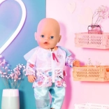 Stylish set for 43 cm dolls from BABY BORN: a comfy light purple jacket with a colorful print and shiny aquamarine pants with seams reminiscent of pool tiles. The outfit also stands out with a transparent overlay effect and is ideal for varied, long-lasting play. Hanger included.