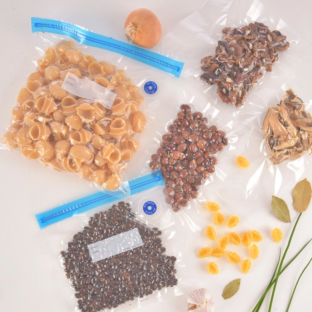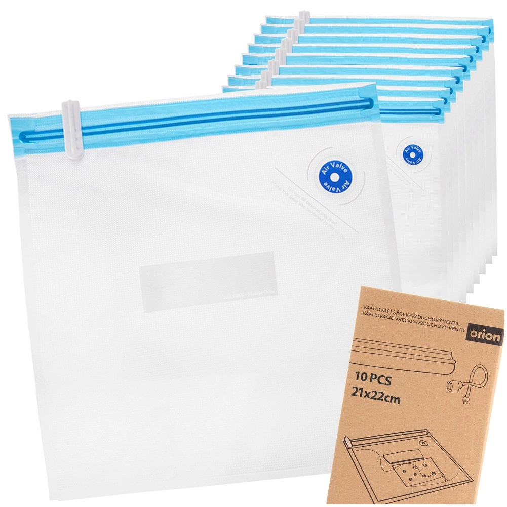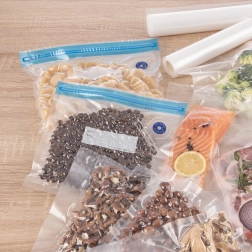Keep your food fresher for longer and neatly organized. Vacuum bags with a practical zipper and a one-way valve allow for quick air removal and reliable sealing. One side is smooth, the other has a textured surface for even vacuuming.