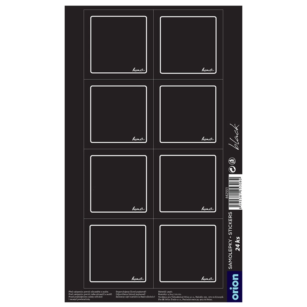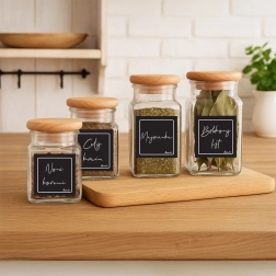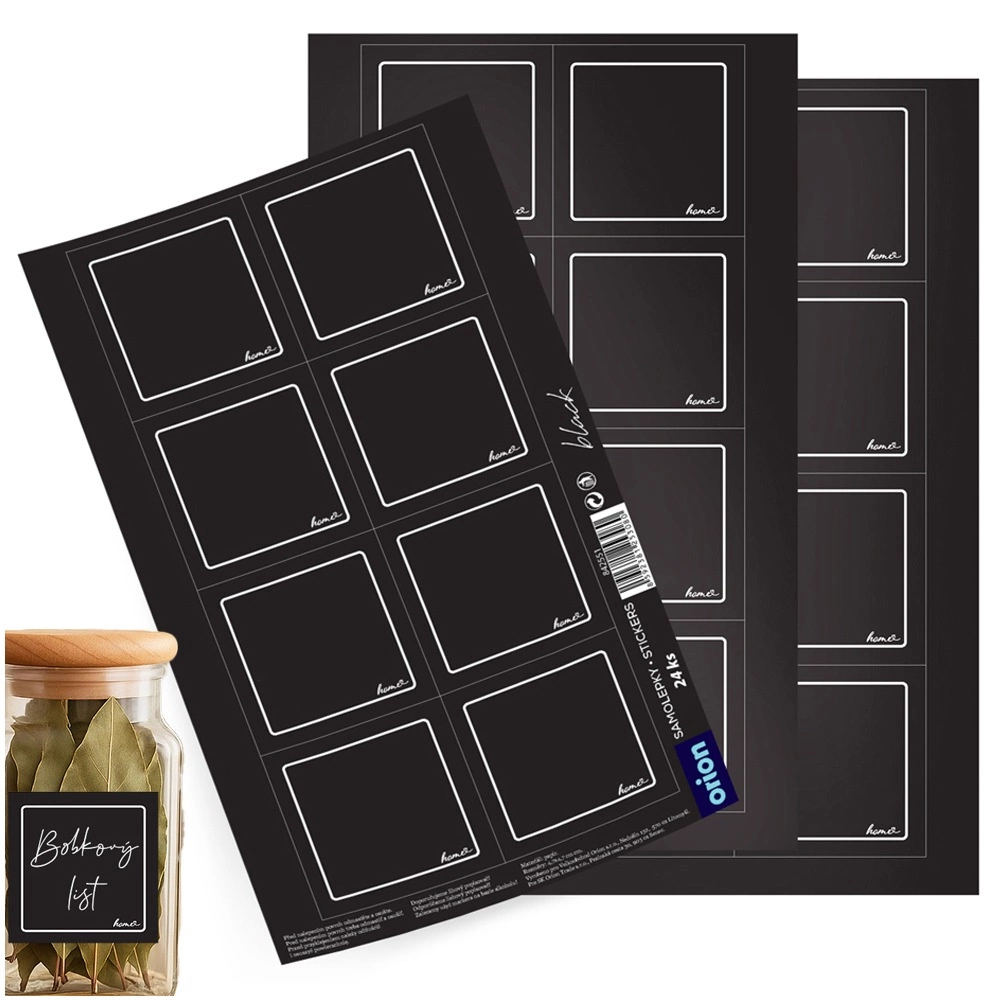 A practical set of 24 self-adhesive labels in elegant black for clearly marking jars, bottles, and containers. Each label measures 4.7 × 4.7 cm, is made of laminated paper, and thanks to the self-adhesive layer requires no glue. The space for your own text ensures readability and order in the pantry and kitchen. Original product by ORION.