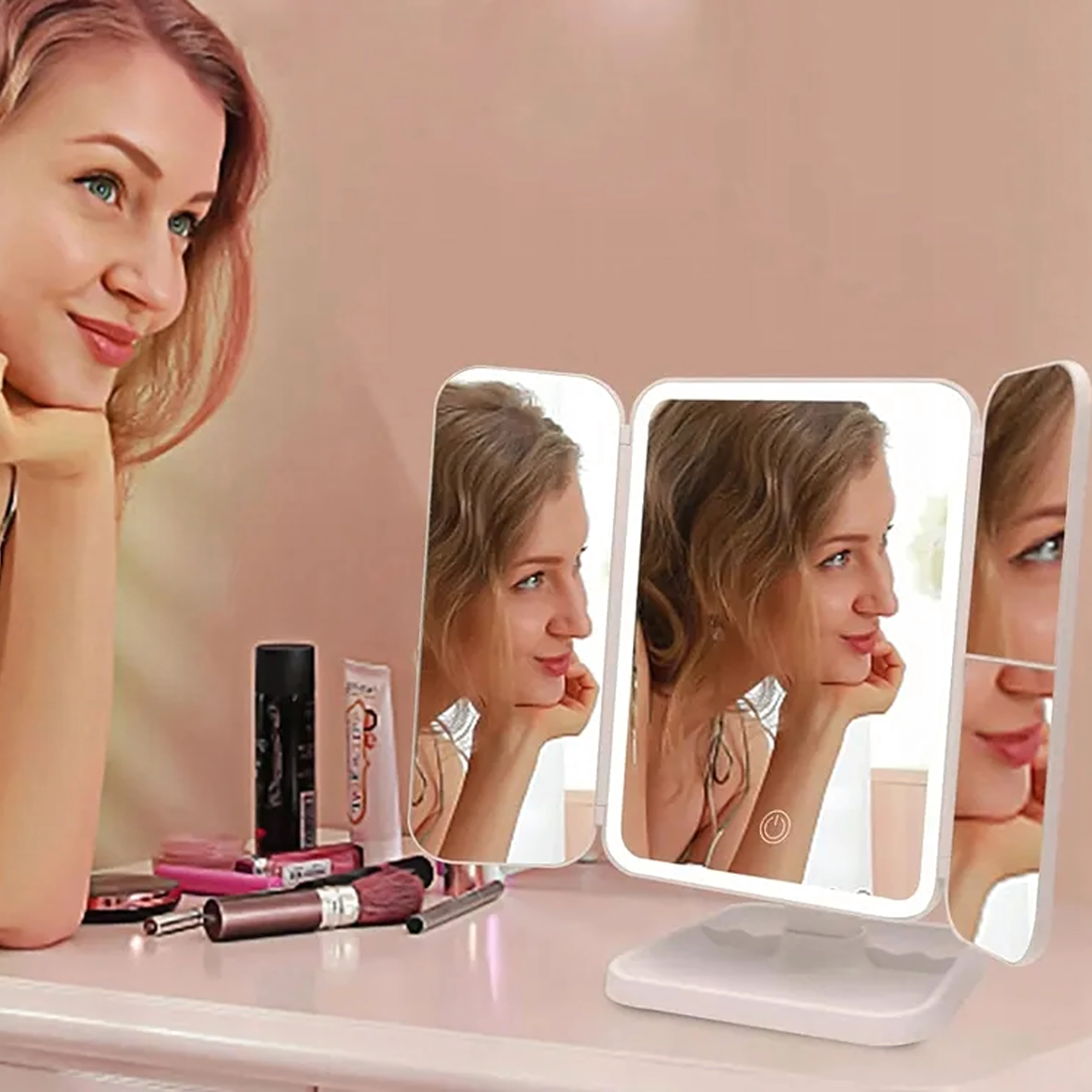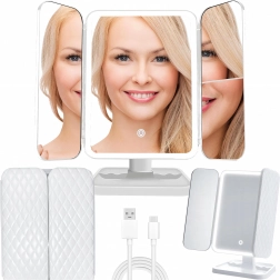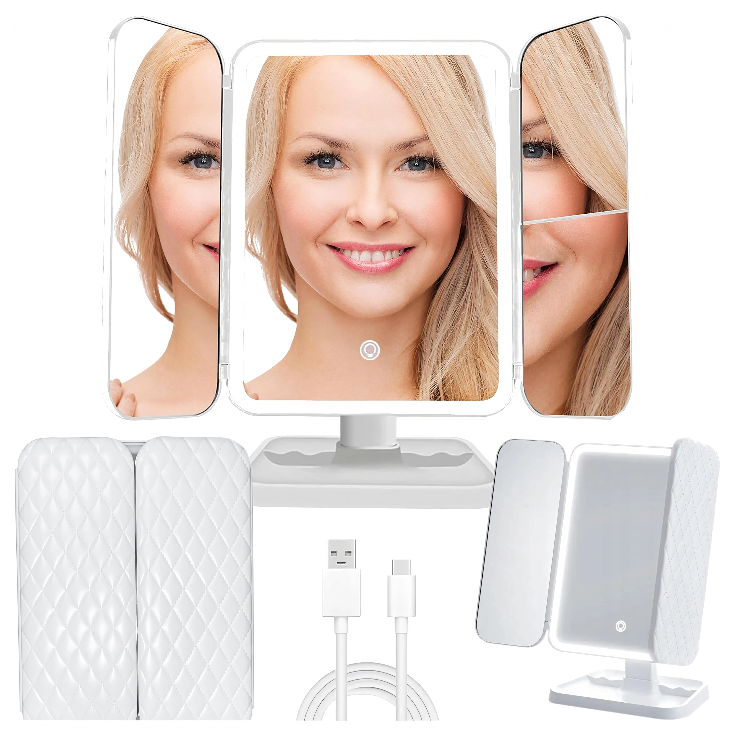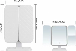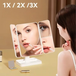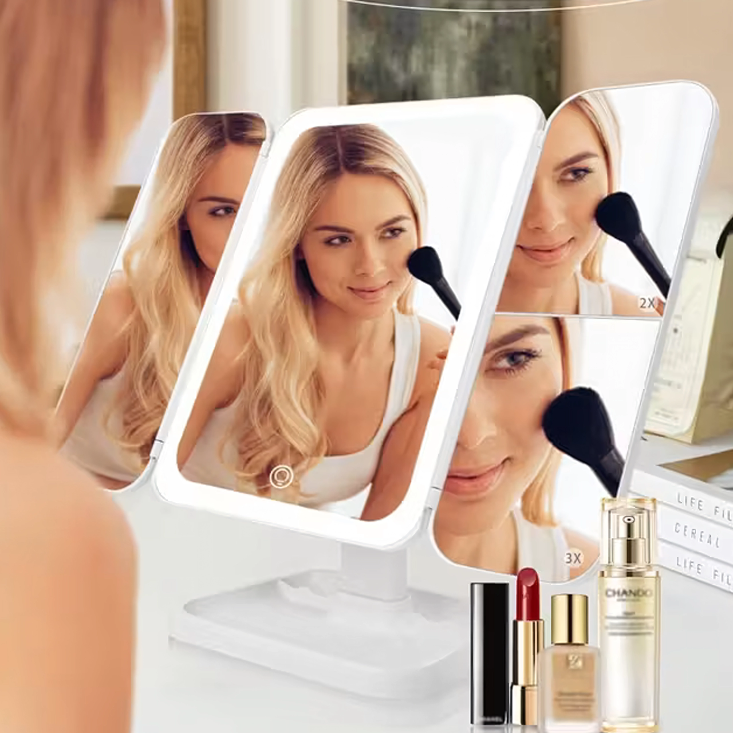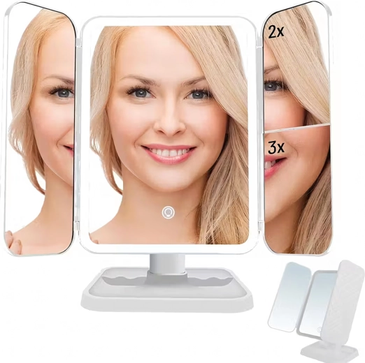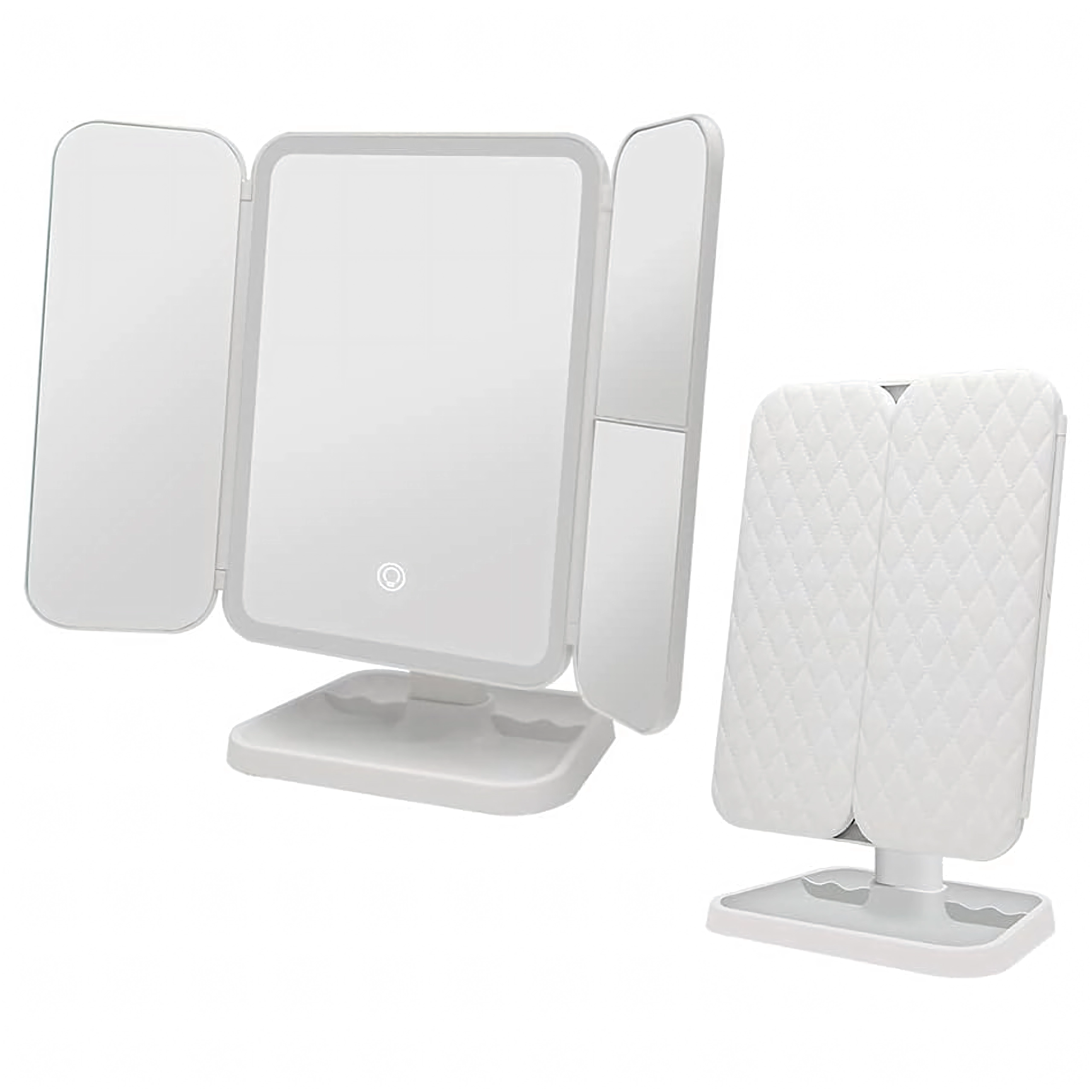 Discover a practical makeup mirror with integrated LED lighting that gives you a bright, even view for makeup, brow grooming, or shaving. The triple panel with different magnifications, including 3× magnification, helps you perfect every detail with total accuracy.