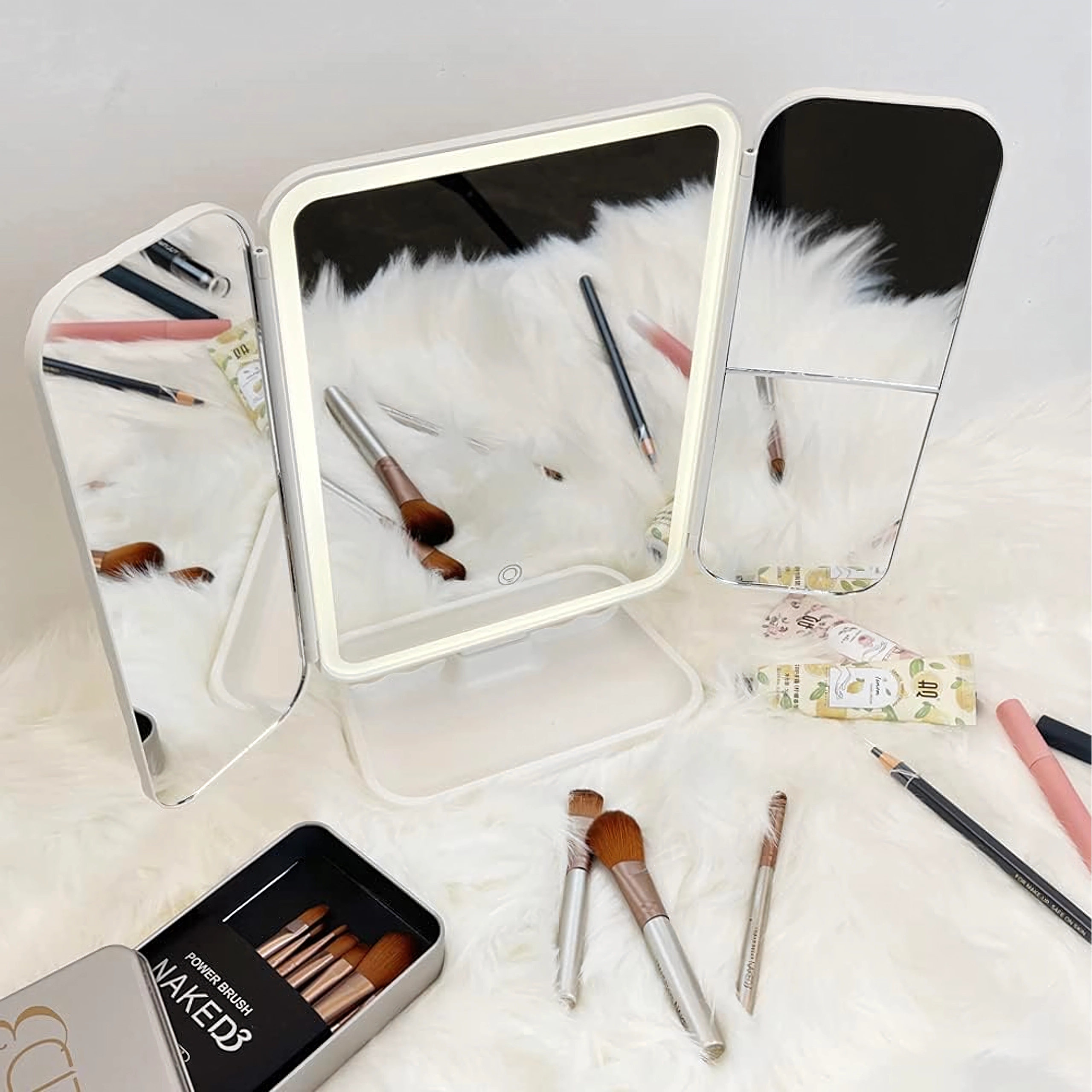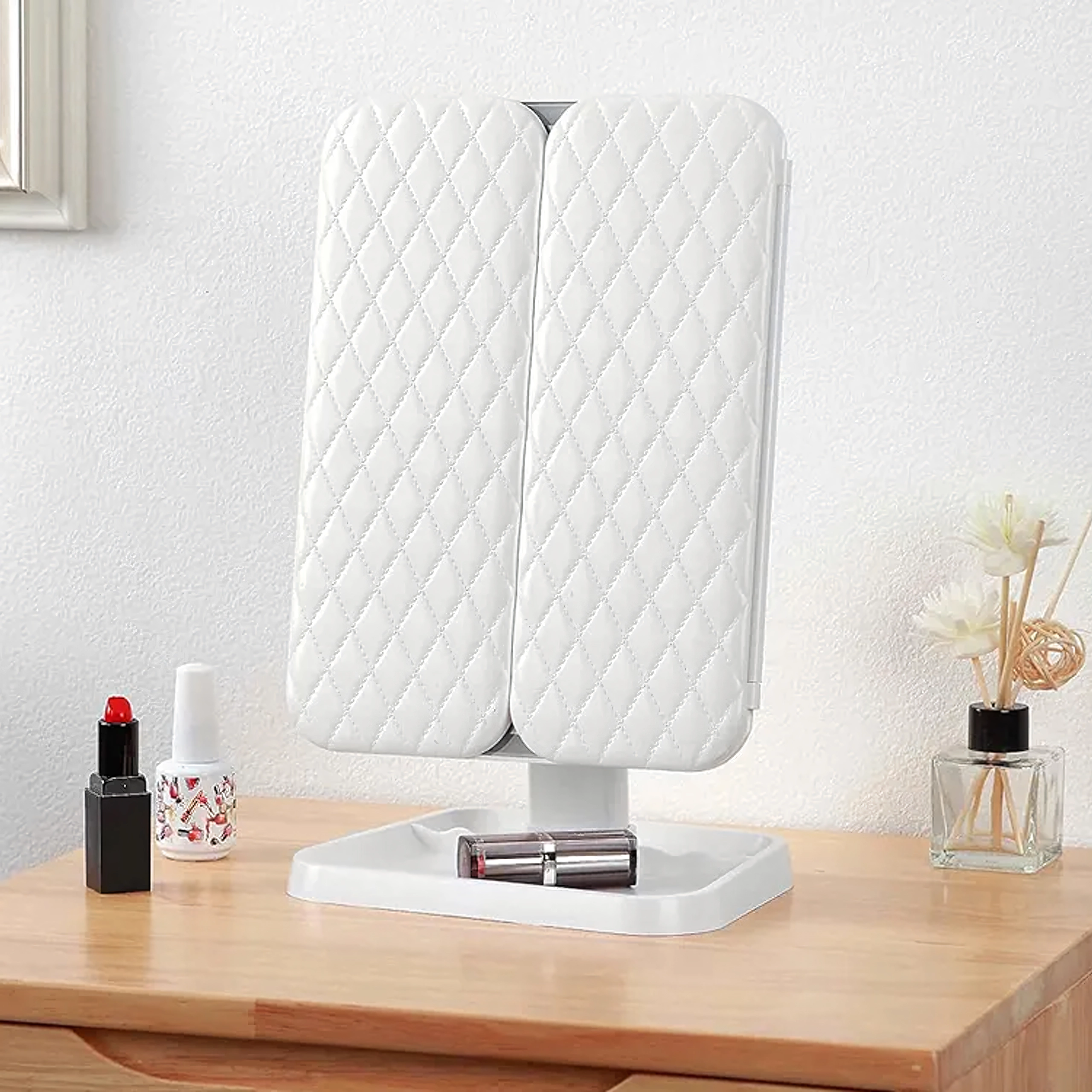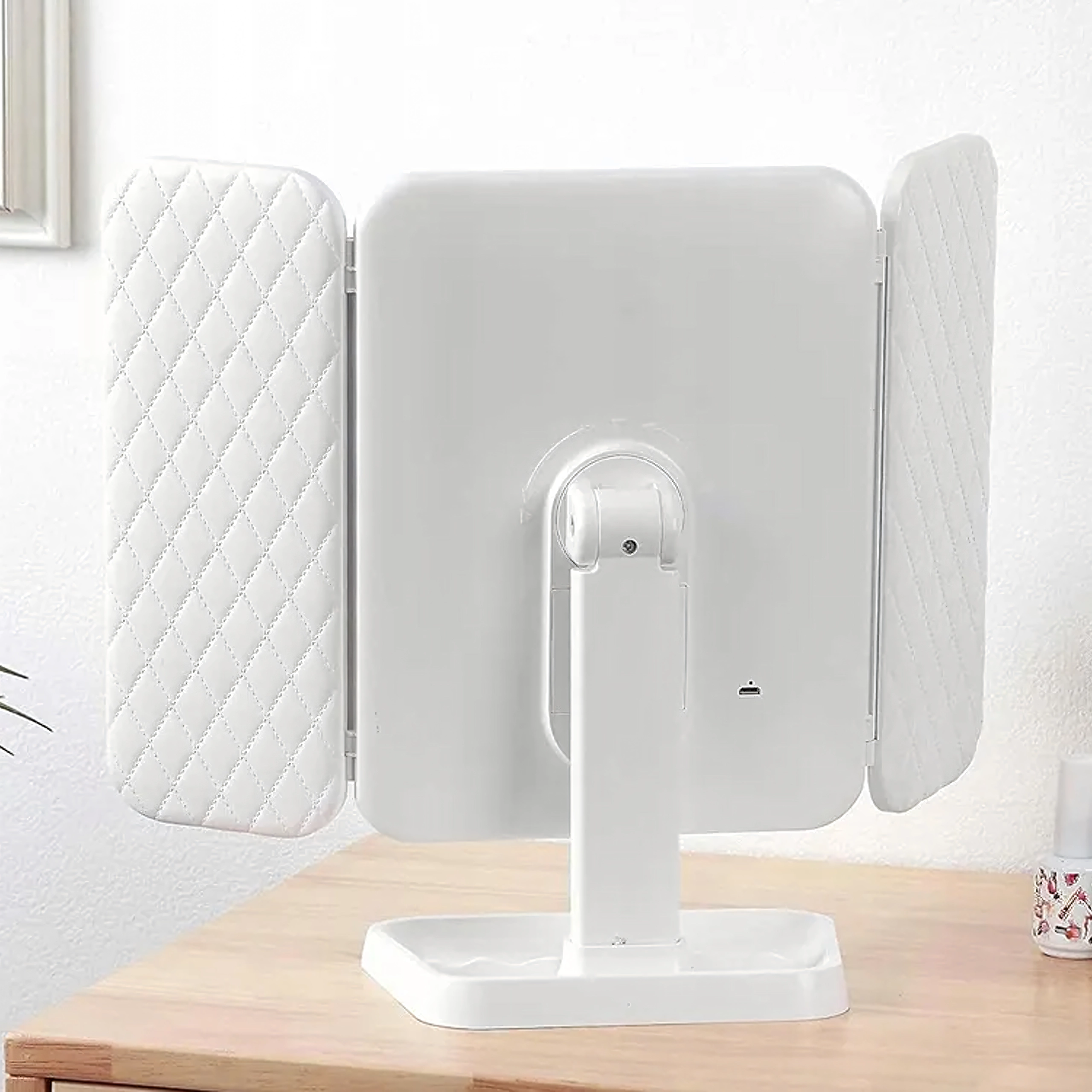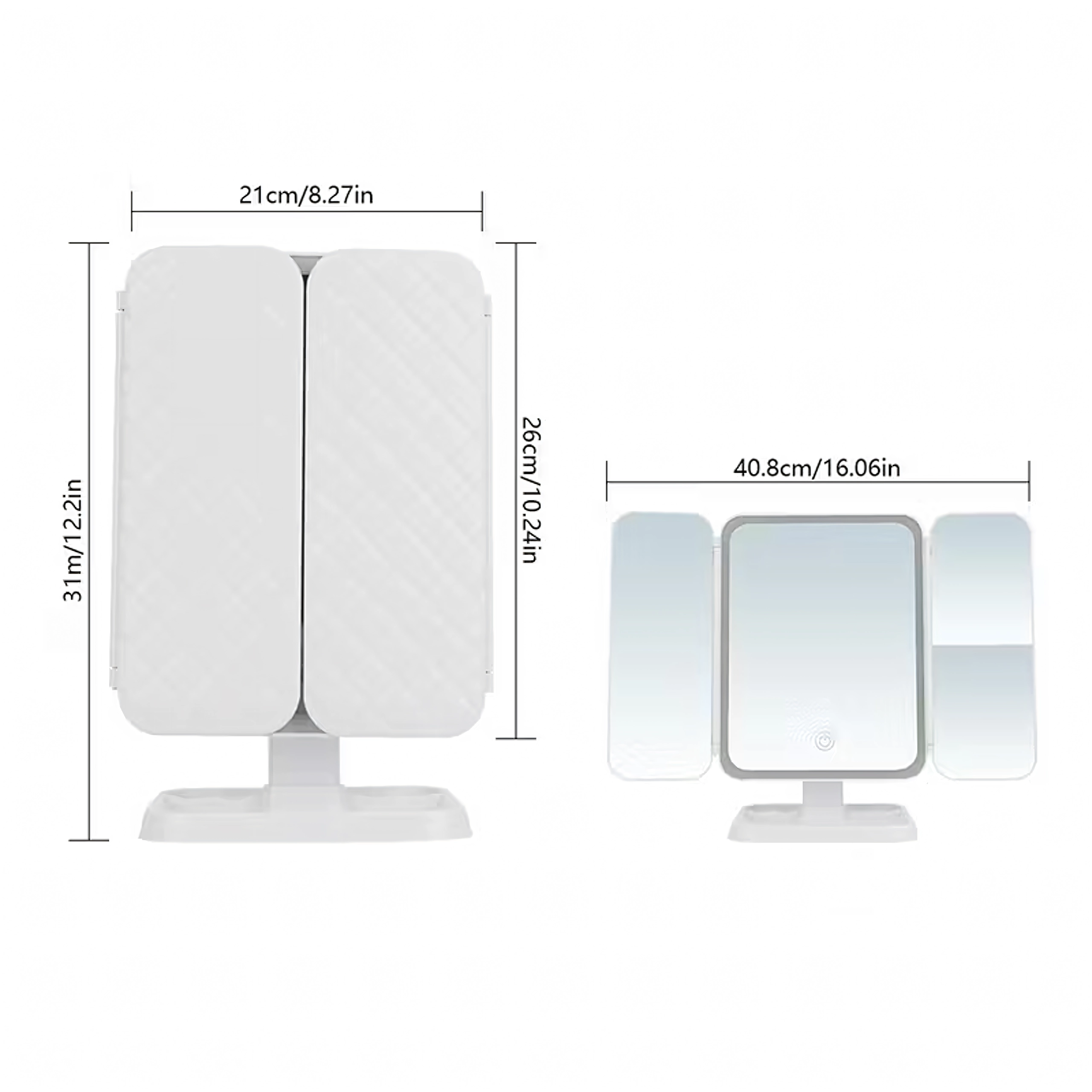 Discover a practical makeup mirror with integrated LED lighting that gives you a bright, even view for makeup, brow grooming, or shaving. The triple panel with different magnifications, including 3× magnification, helps you perfect every detail with total accuracy.