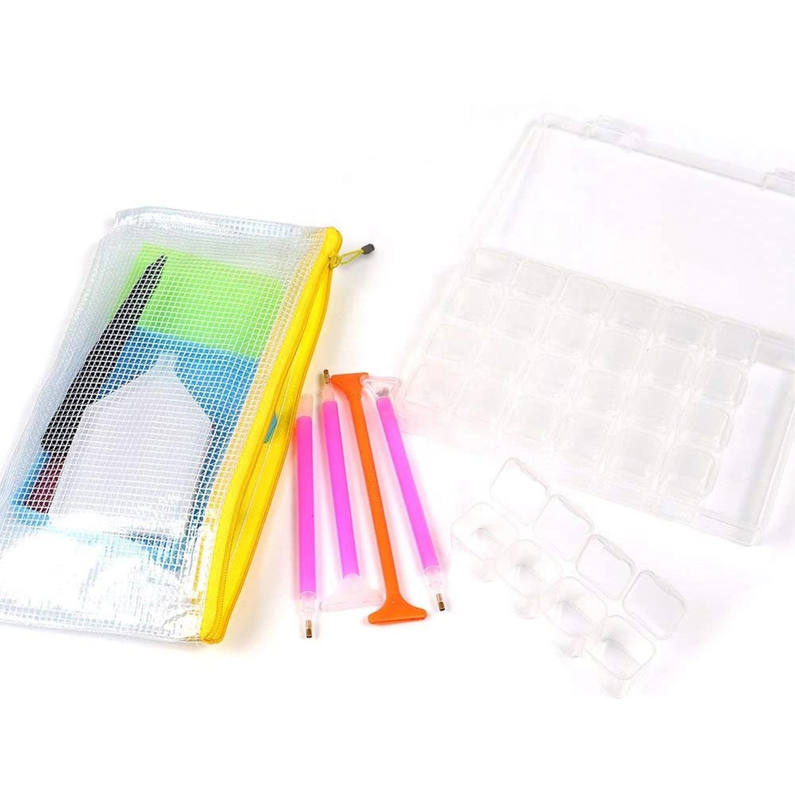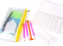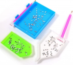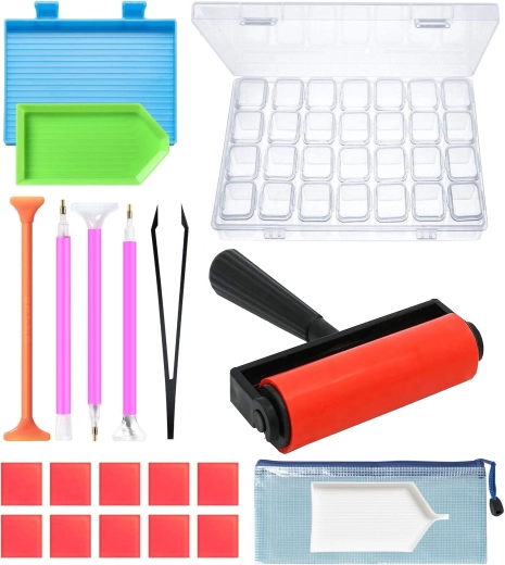 A complete diamond painting kit that makes creating sparkling mosaics easier. It includes a roller for even pressing of drills, sorting trays, applicators, tweezers, wax, and practical organizers to keep all beads neatly at hand.