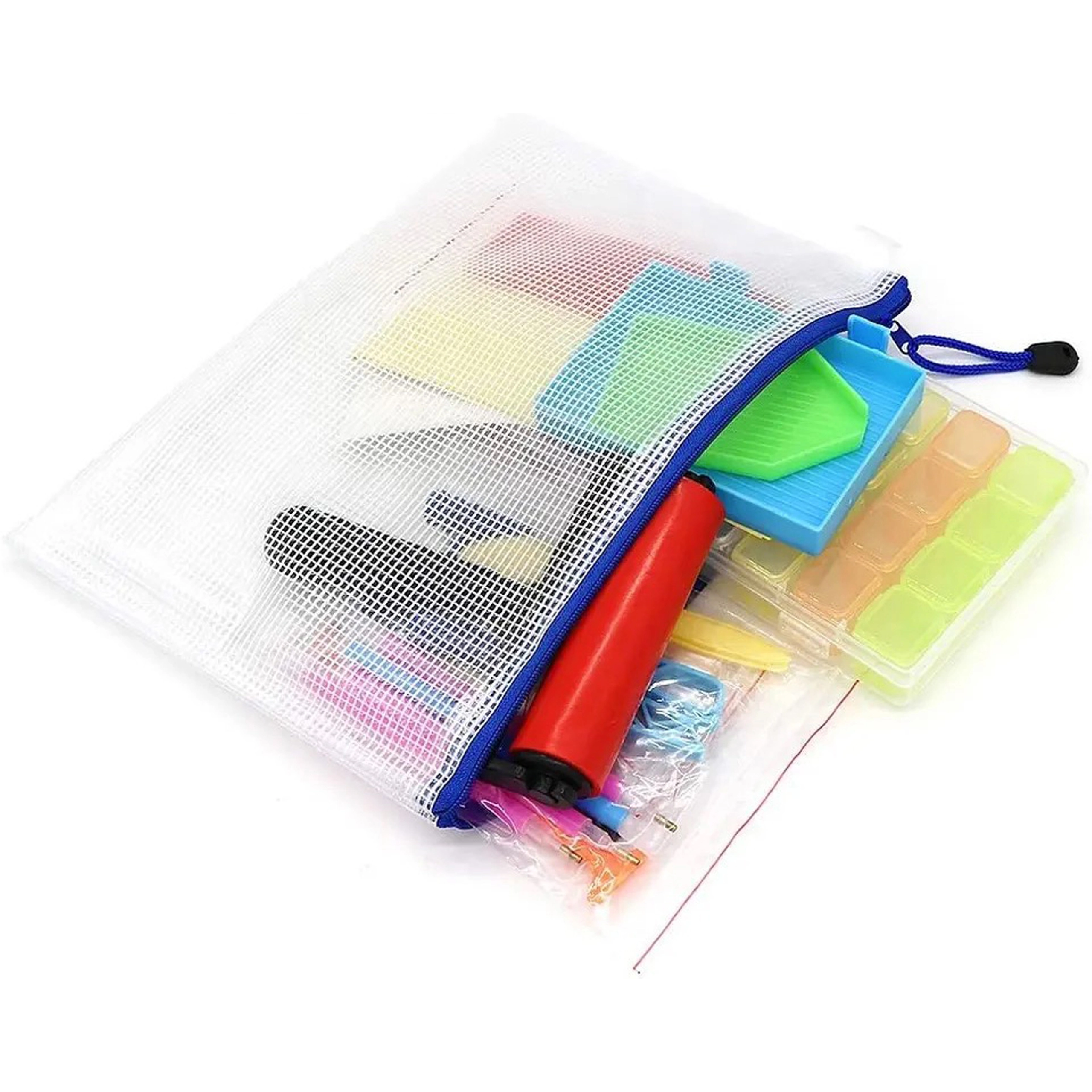 A transparent zippered mesh pouch and a compartmentalized box keep everything organized and ready for crafting anywhere.