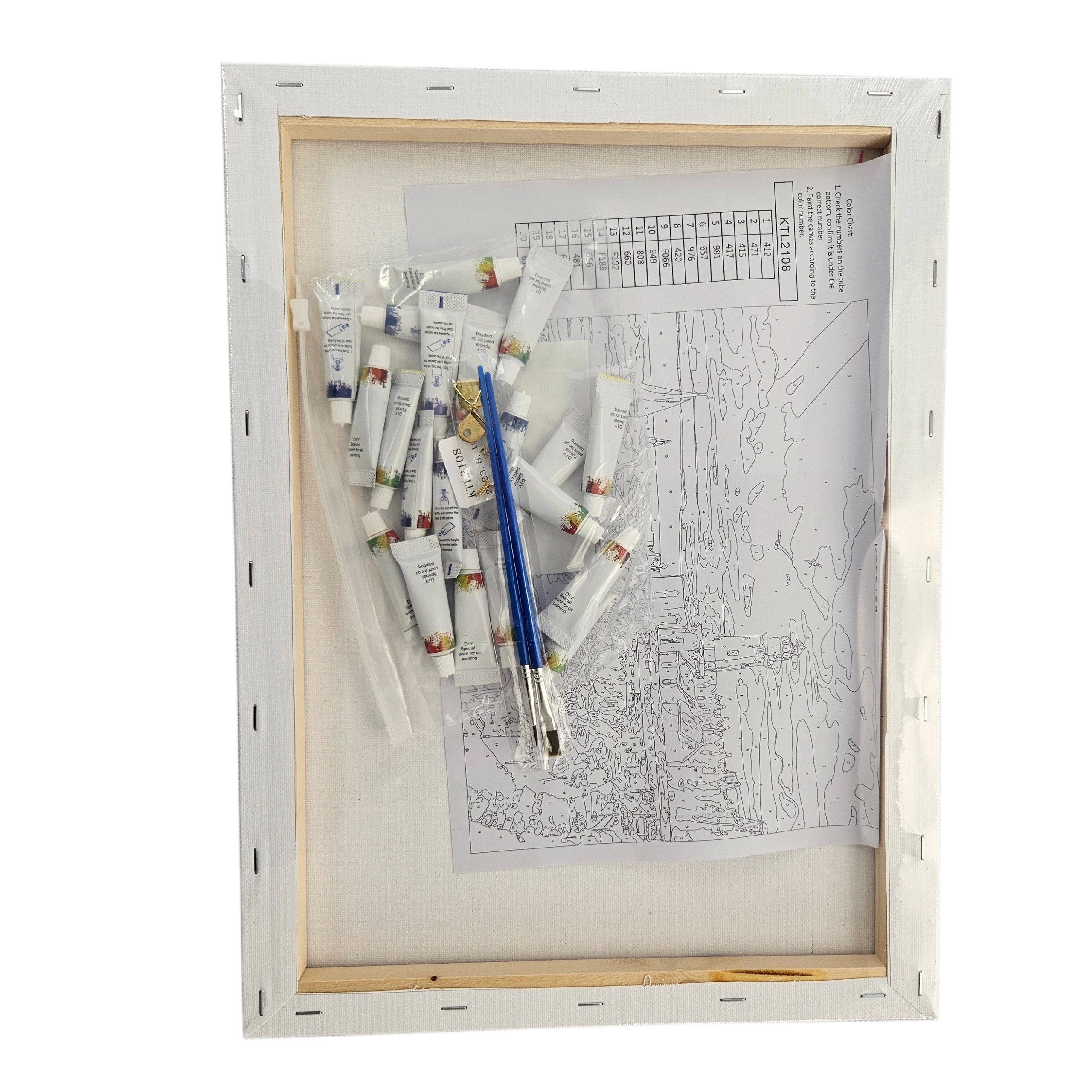 The set includes a 30 × 40 cm canvas, acrylic paints, and brushes—just open and start painting with no extra purchases needed.